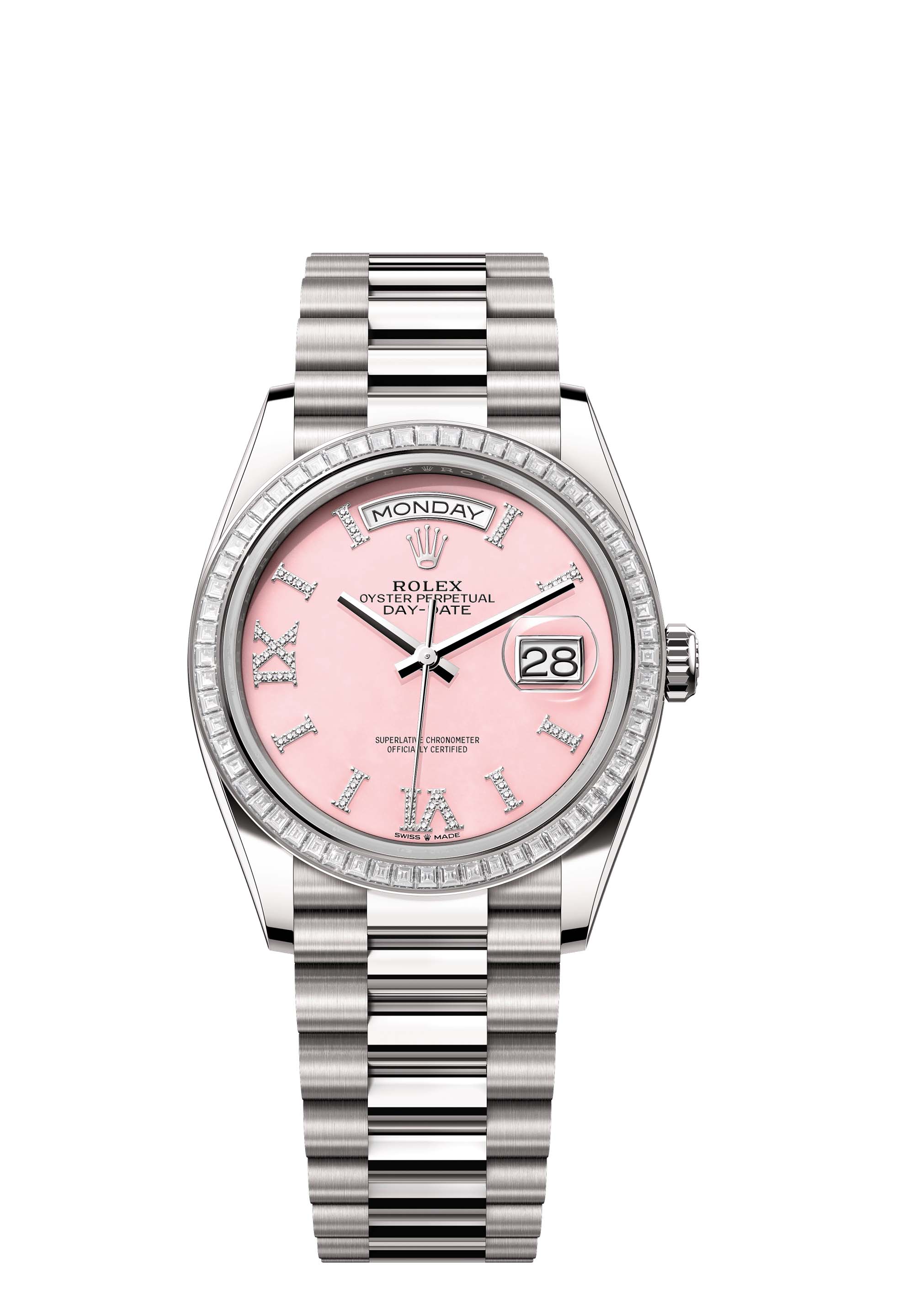 The Oyster Perpetual Day-Date 36 in 18 ct white gold, with a pink opal, diamond-set dial, diamond-set bezel and a President bracelet.