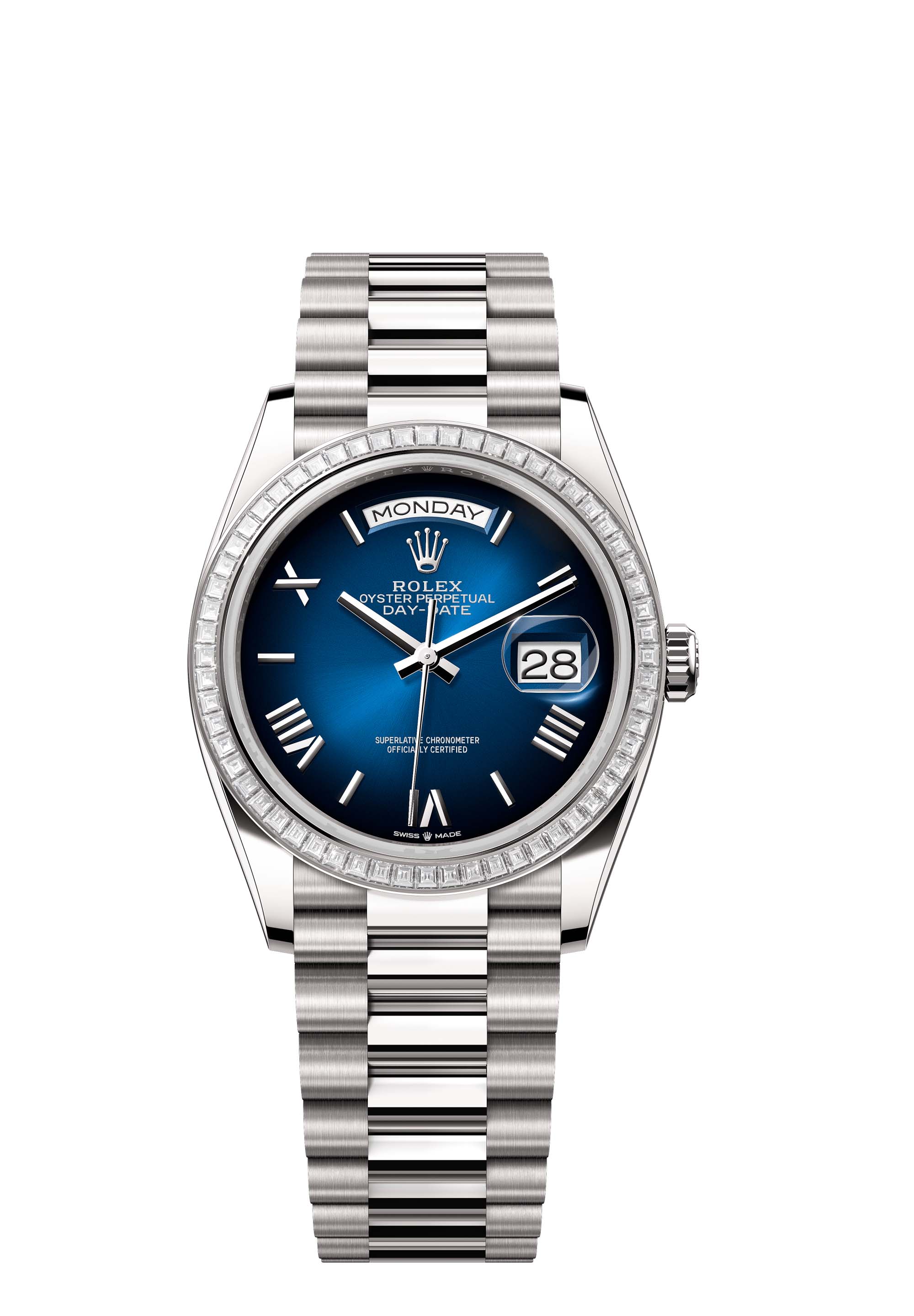 The Oyster Perpetual Day-Date 36 in 18 ct white gold with a blue ombré dial, diamond-set bezel and a President bracelet.