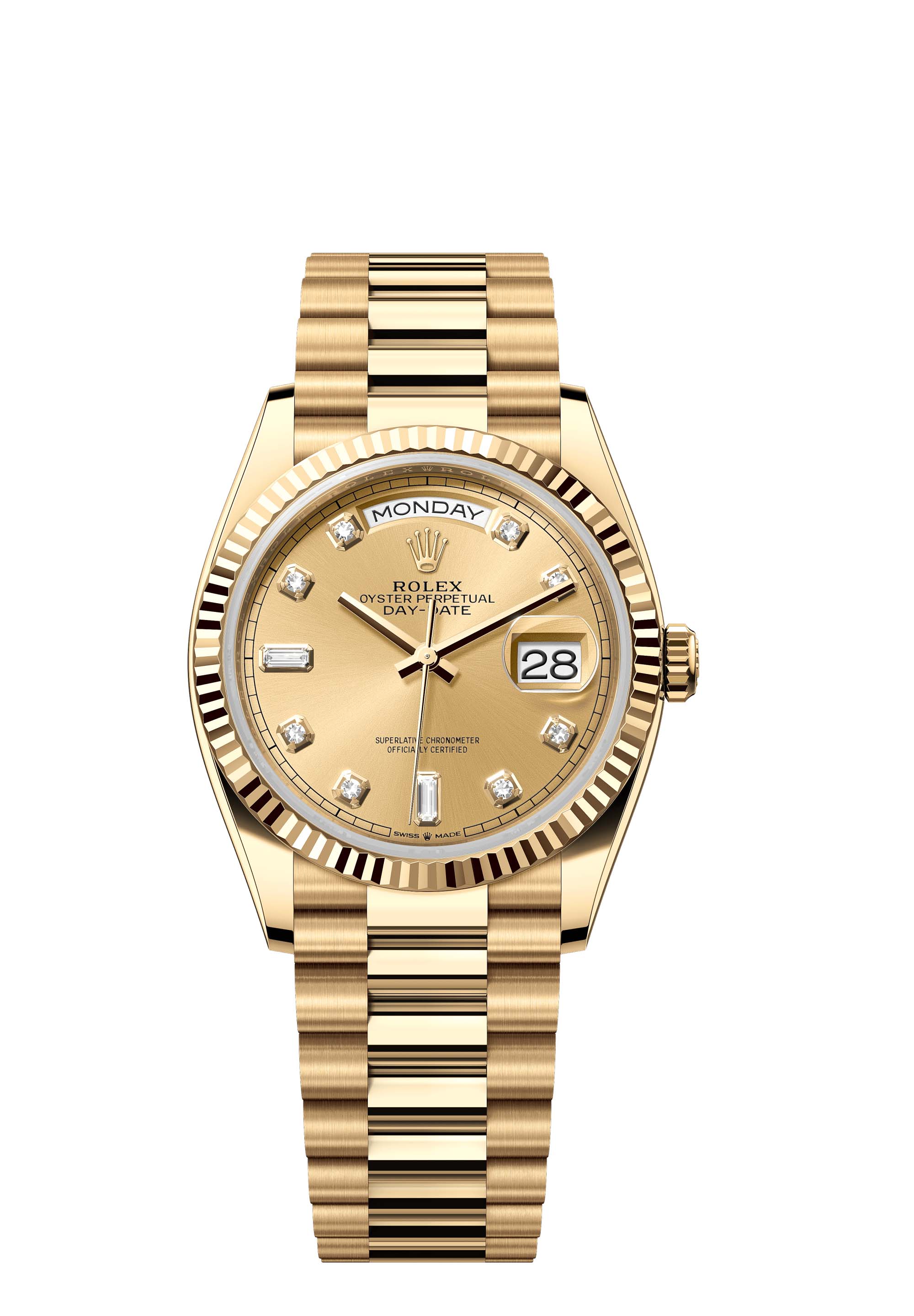 The Oyster Perpetual Day-Date 36 in 18 ct yellow gold with a champagne-colour, diamond-set dial, fluted bezel and a President bracelet.