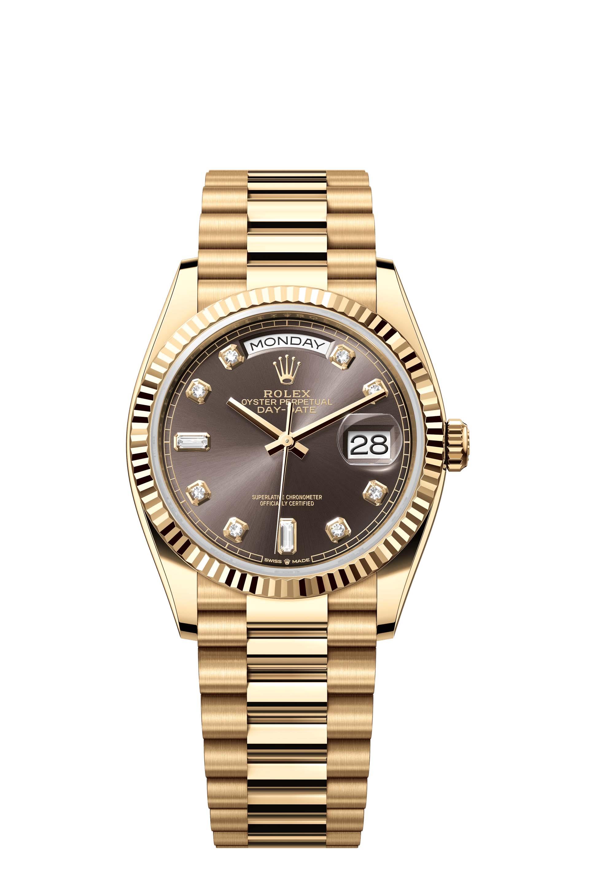 The Rolex fluted bezel is a mark of distinction. Originally, the fluting of the Oyster bezel had a functional purpose: it served to screw the bezel onto the case helping to ensure the waterproofness of the watch. It was therefore identical to the fluting on the case back, which was also screwed onto the case for waterproofness, using specific Rolex tools. Over time, the fluting became an aesthetic element, a genuine Rolex signature feature. Today the fluted bezel is a mark of distinction, in gold on this Day-Date 36.