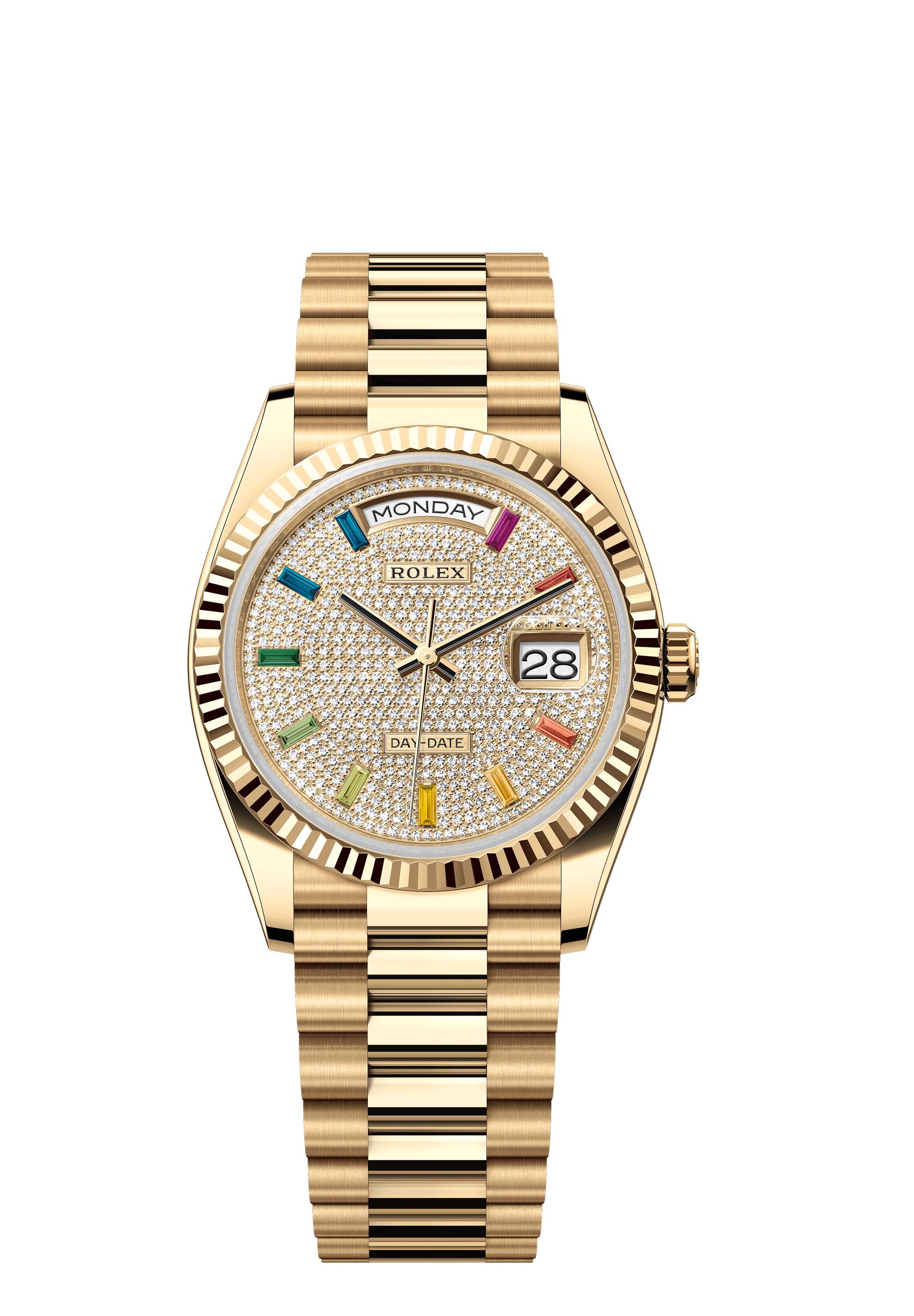 The Oyster Perpetual Day-Date 36 in 18 ct yellow gold with a diamond-paved dial, fluted bezel and a President bracelet.