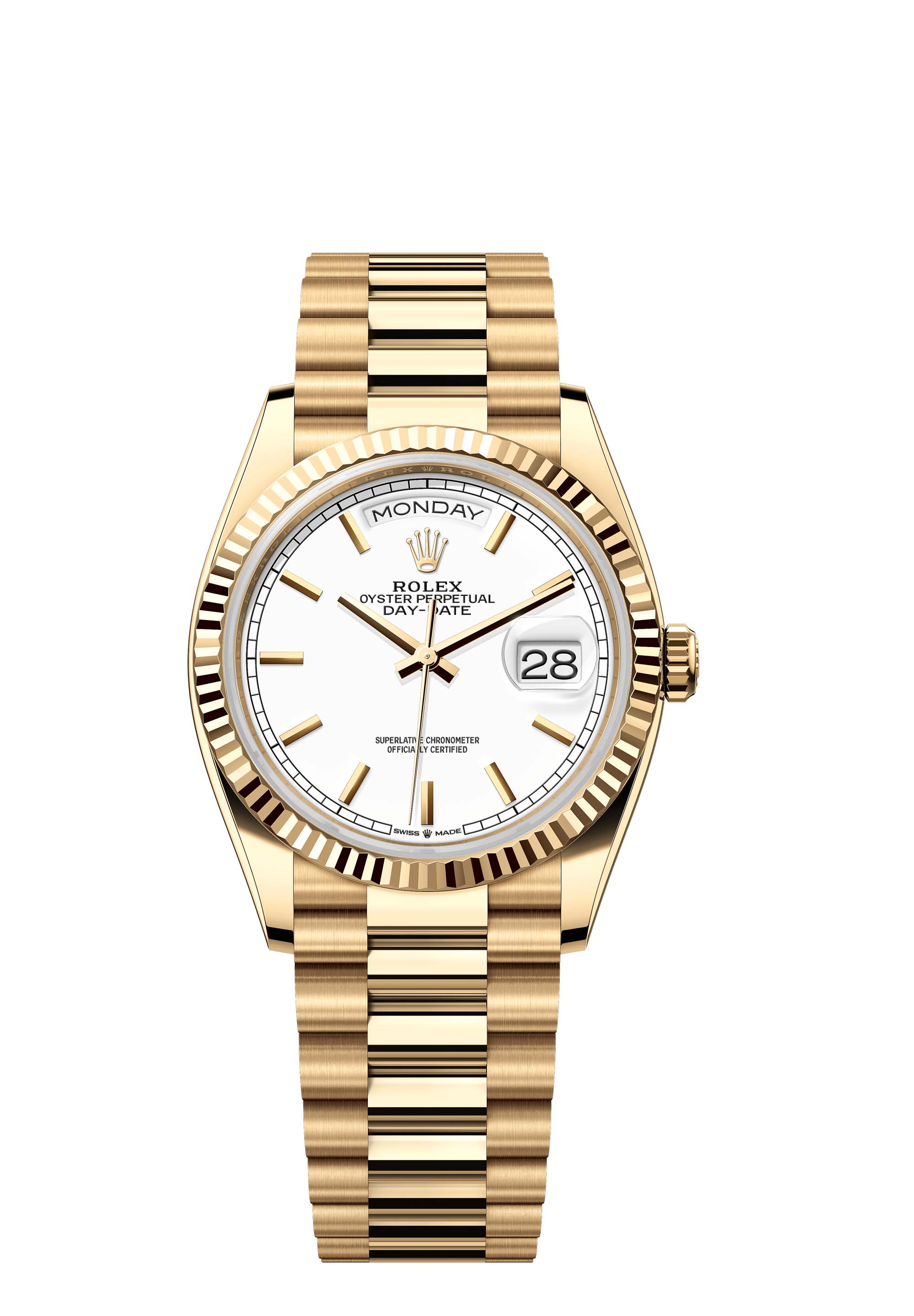 The Oyster Perpetual Day-Date 36 in 18 ct yellow gold with a white dial, fluted bezel and a President bracelet.