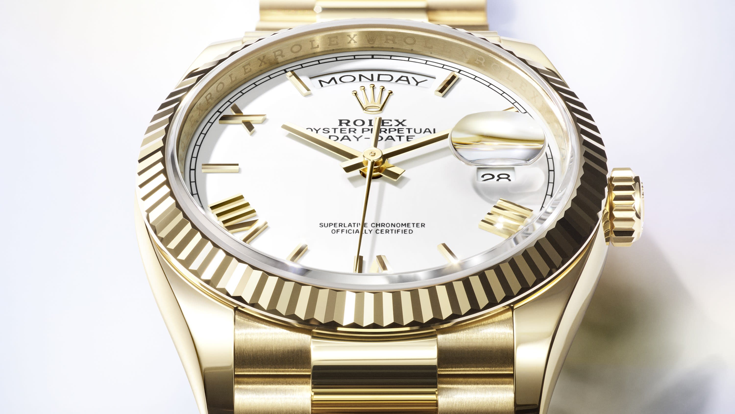 The Rolex fluted bezel is a mark of distinction. Originally, the fluting of the Oyster bezel had a functional purpose: it served to screw the bezel onto the case helping to ensure the waterproofness of the watch. It was therefore identical to the fluting on the case back, which was also screwed onto the case for waterproofness, using specific Rolex tools. Over time, the fluting became an aesthetic element, a genuine Rolex signature feature. Today the fluted bezel is a mark of distinction, in gold on this Day-Date 36.