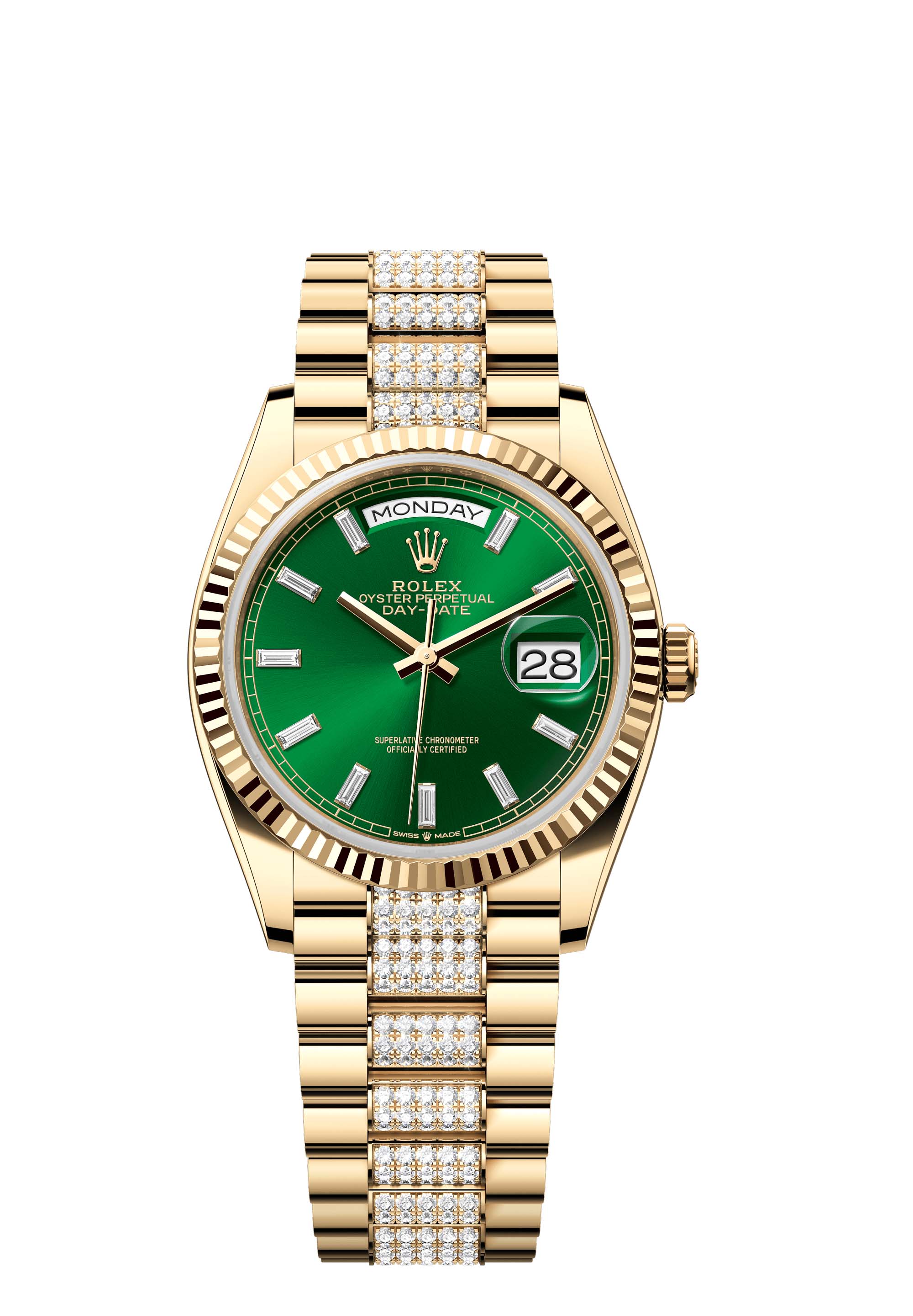 The Oyster Perpetual Day-Date 36 in 18 ct yellow gold with a bright green, diamond-set dial, fluted bezel and a diamond-set President bracelet.