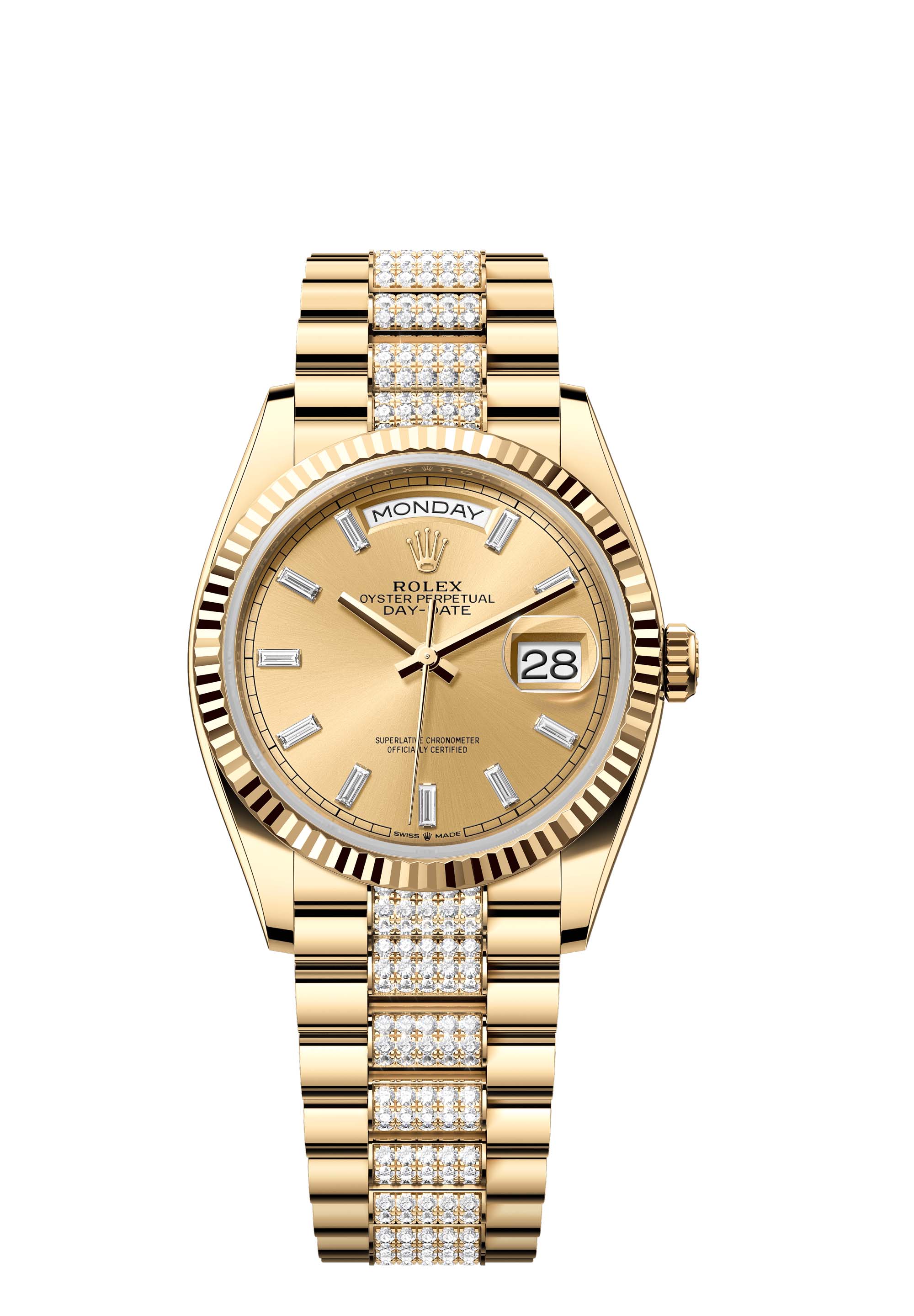 The Oyster Perpetual Day-Date 36 in 18 ct yellow gold with a champagne colour, diamond-set dial, fluted bezel and a diamond-set President bracelet.