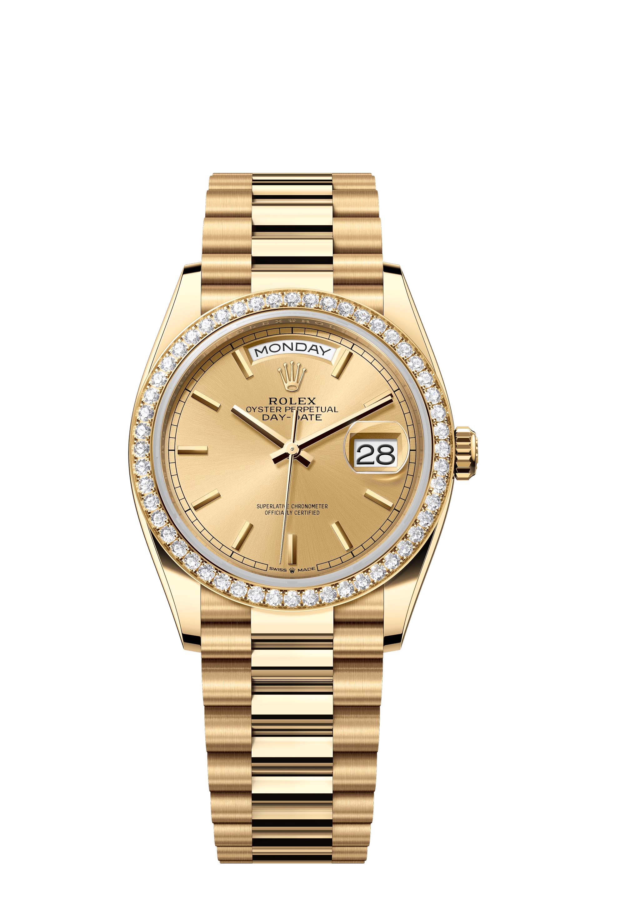 The Oyster Perpetual Day-Date 36 in 18 ct yellow gold with a champagne-colour dial, diamond-set bezel and a President bracelet.