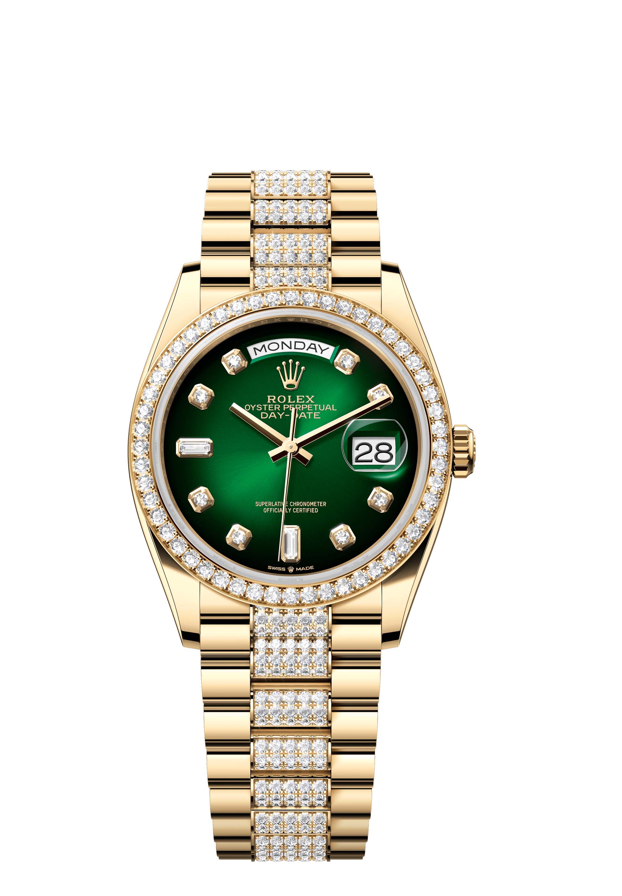 The Oyster Perpetual Day-Date 36 in 18 ct yellow gold, with a green ombré, diamond-set dial, diamond-set bezel and a diamond-set President bracelet.
