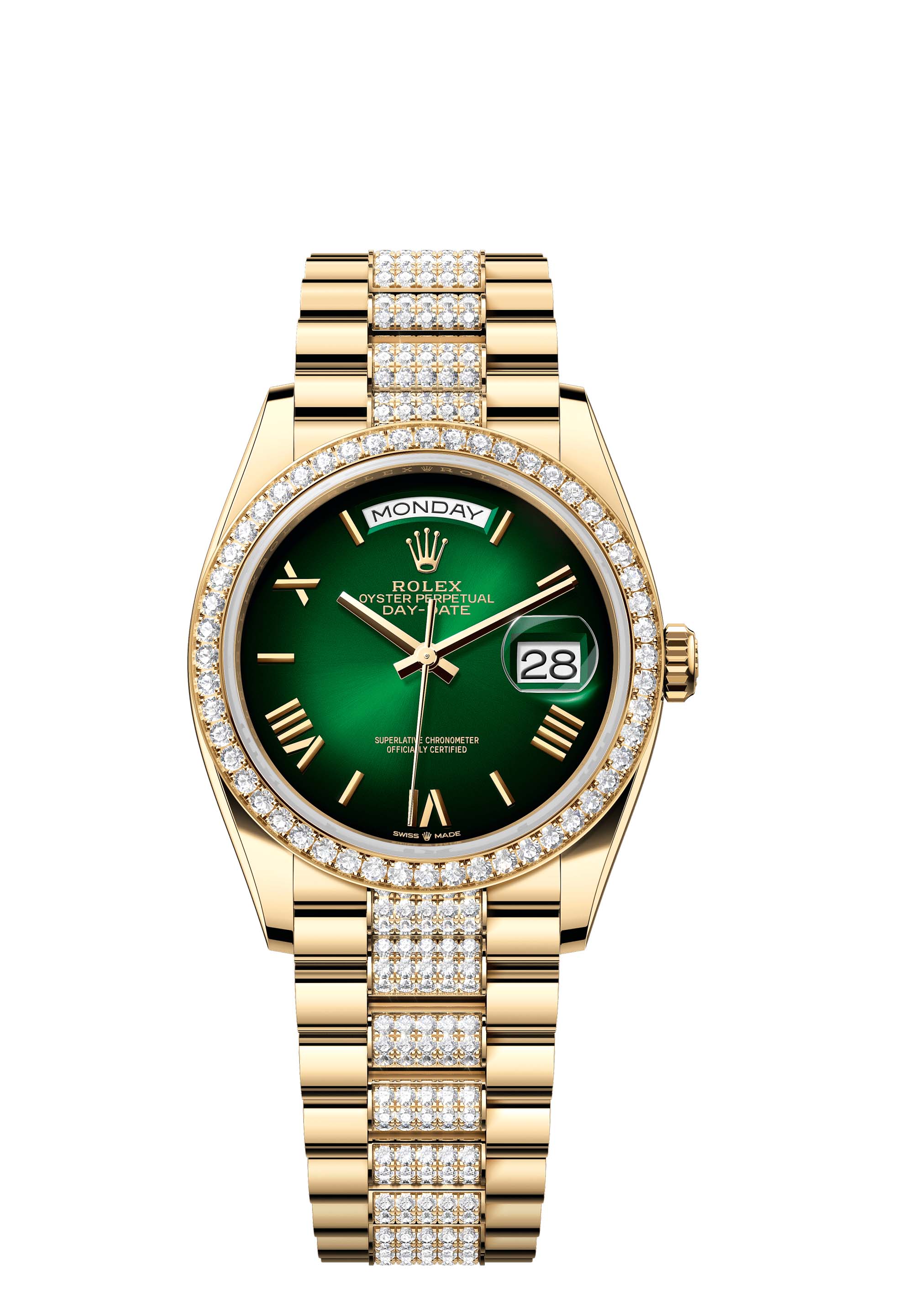 The Oyster Perpetual Day-Date 36 in 18 ct yellow gold with a green ombré dial, diamond-set bezel and a diamond-set President bracelet.