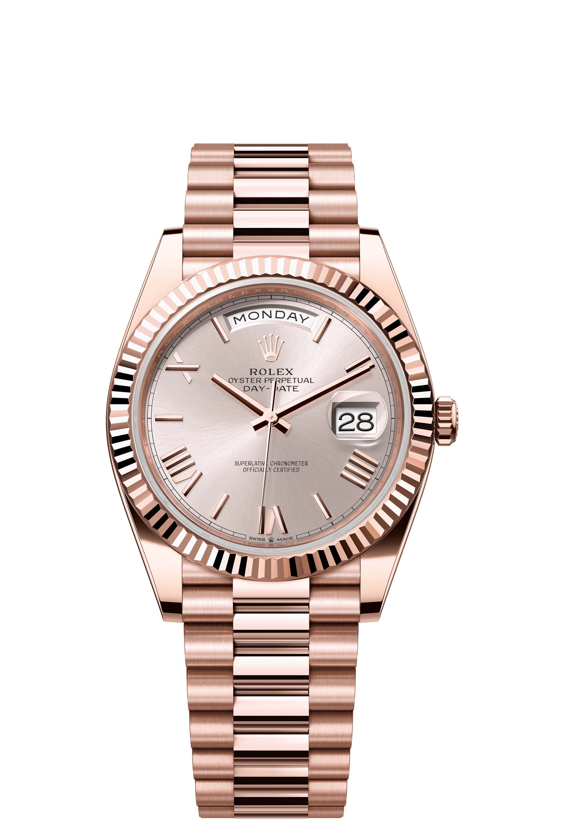 The Oyster Perpetual Day-Date 40 in 18 ct Everose gold with a Sundust dial, fluted bezel and a President bracelet.