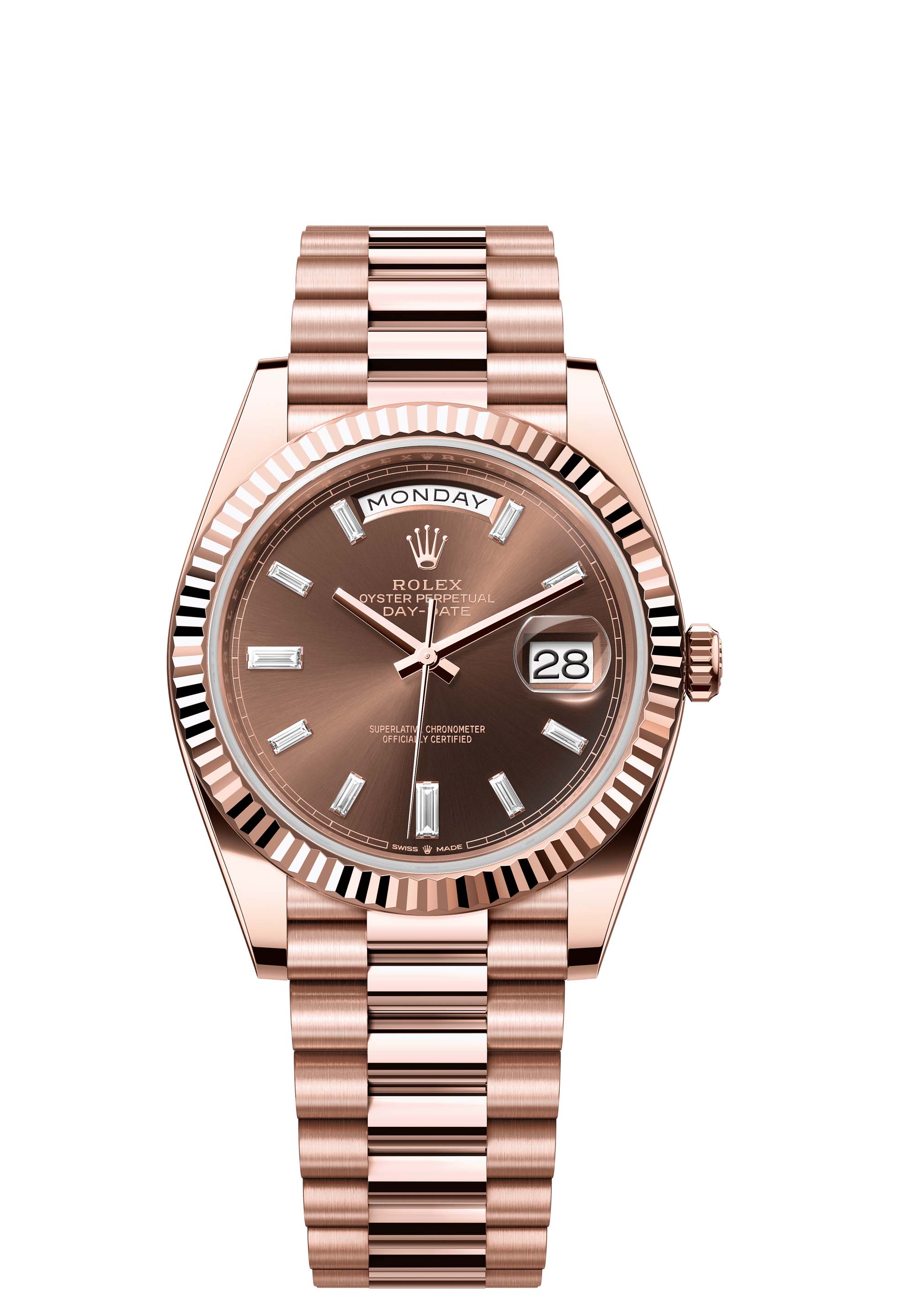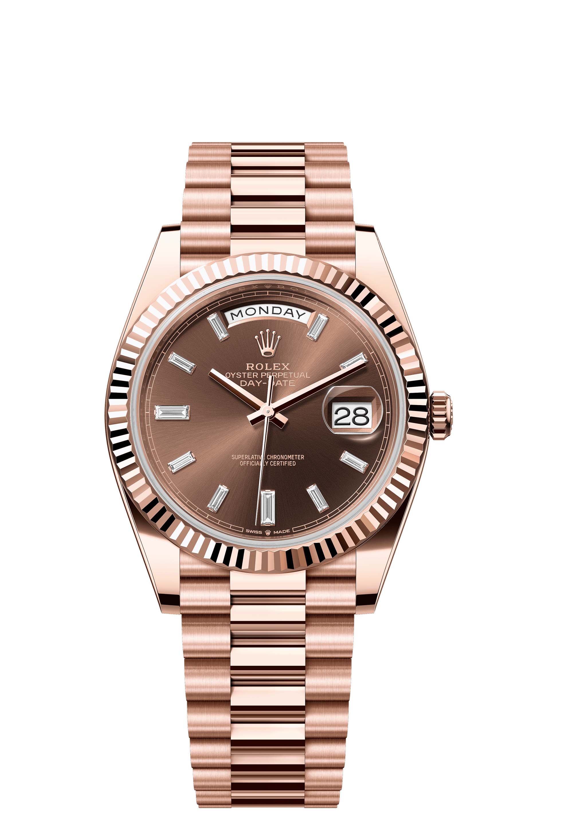 The Oyster Perpetual Day-Date 40 in 18 ct Everose gold with a chocolate, diamond-set dial, fluted bezel and a President bracelet.