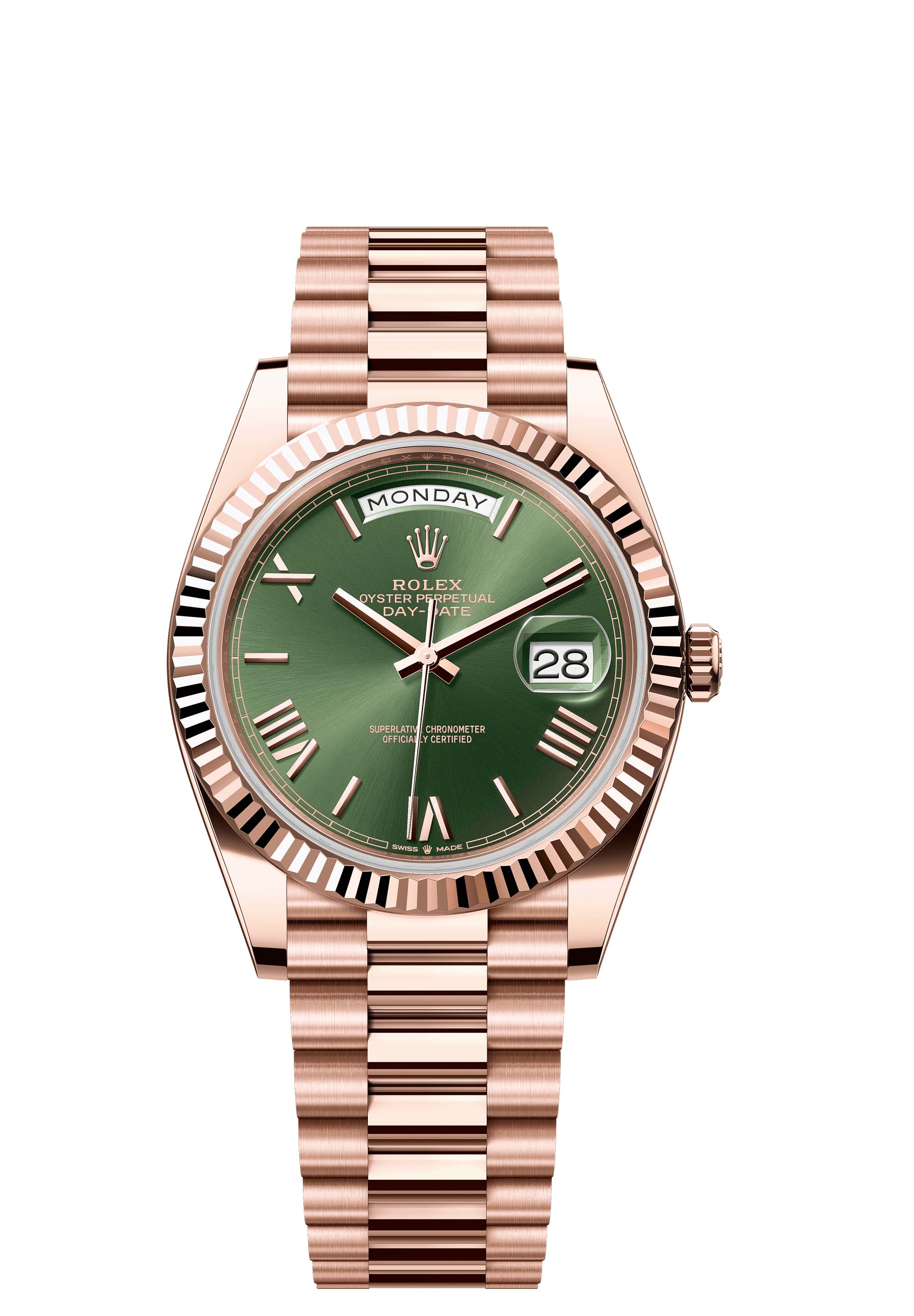 The Oyster Perpetual Day-Date 40 in 18 ct Everose gold with an olive-green dial, fluted bezel and a President bracelet.