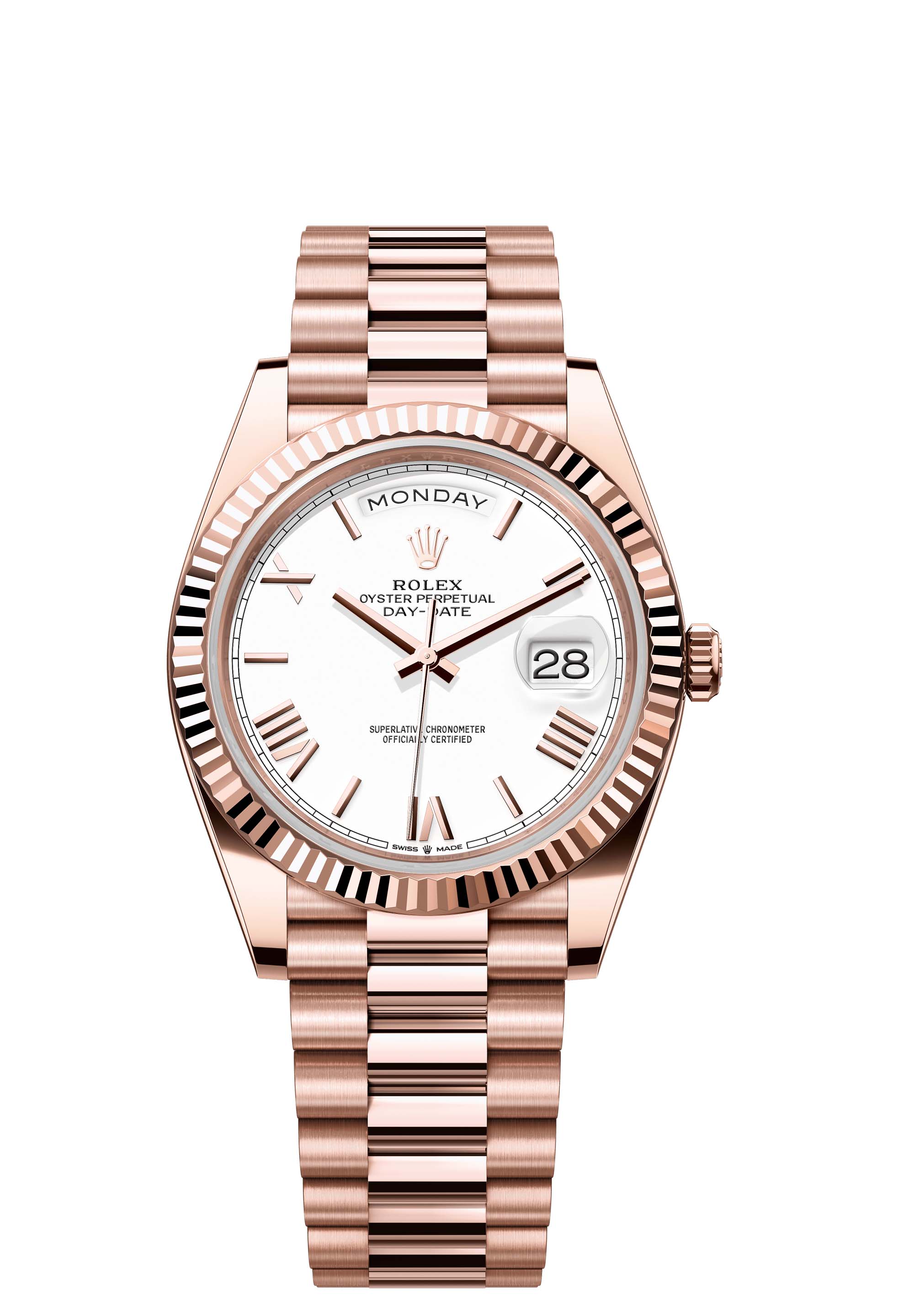 The Oyster Perpetual Day-Date 40 in 18 ct Everose gold with a white dial, fluted bezel and a President bracelet.