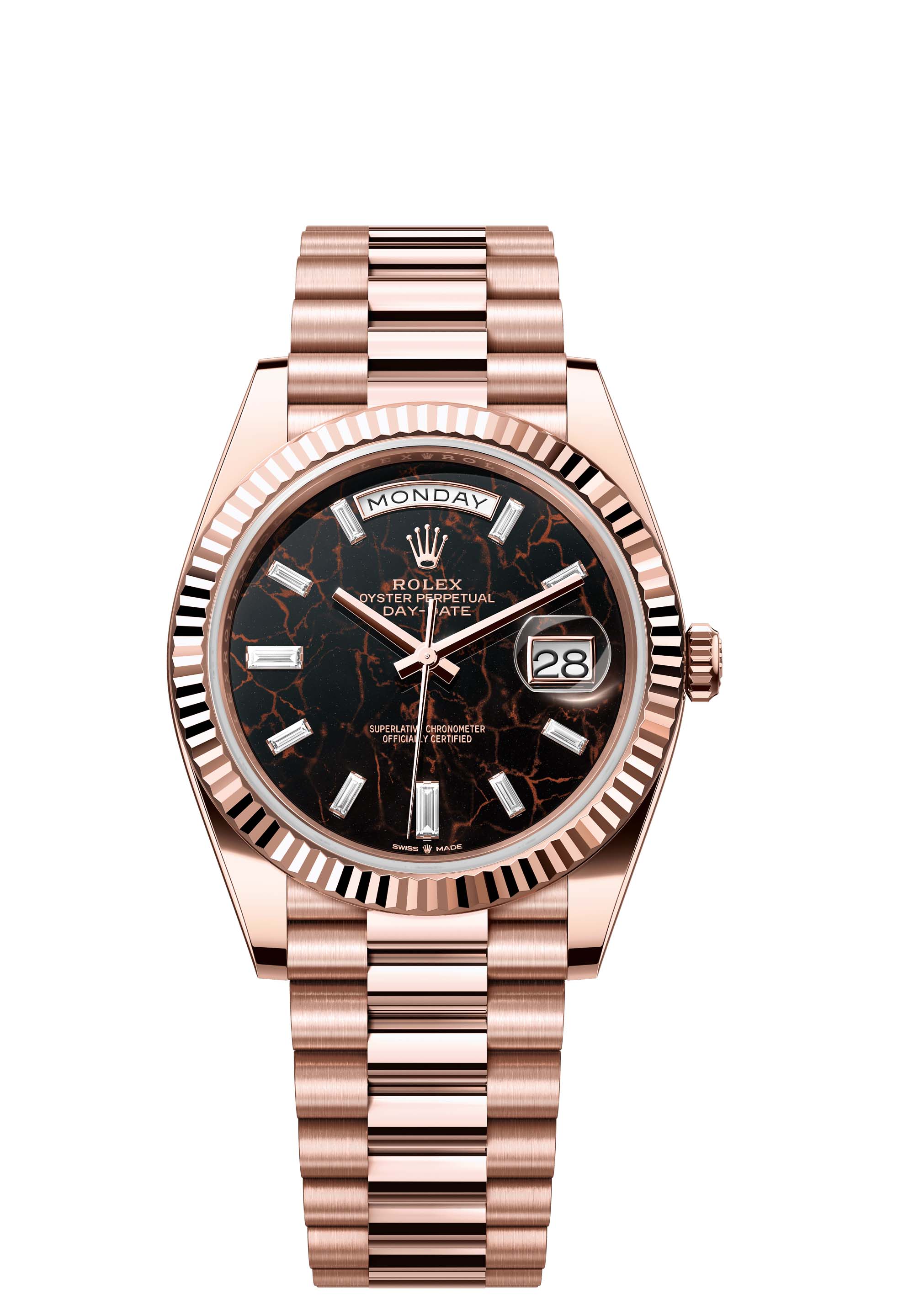 This dial features 10 baguette-cut diamonds. The Oyster Perpetual Day-Date 40 is presented with a dial made from eisenkiesel, a deep brown decorative stone used by the brand for the first time in 2021. Eisenkiesel is an iron-oxide, delicately veined quartz. The stone discs destined for the dials are cut from a block of raw material. Only those whose colour and structure fully satisfy the brand’s exacting aesthetic requirements are selected. They will grace the dial of a Rolex watch, conferring it with a unique personality.