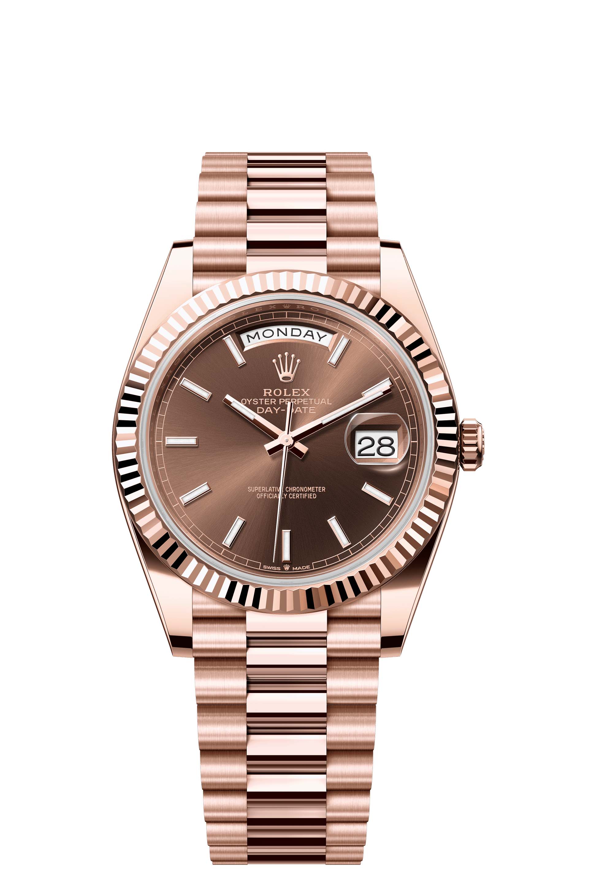 The Oyster Perpetual Day-Date 40 in 18 ct Everose gold with a chocolate dial, fluted bezel and a President bracelet.