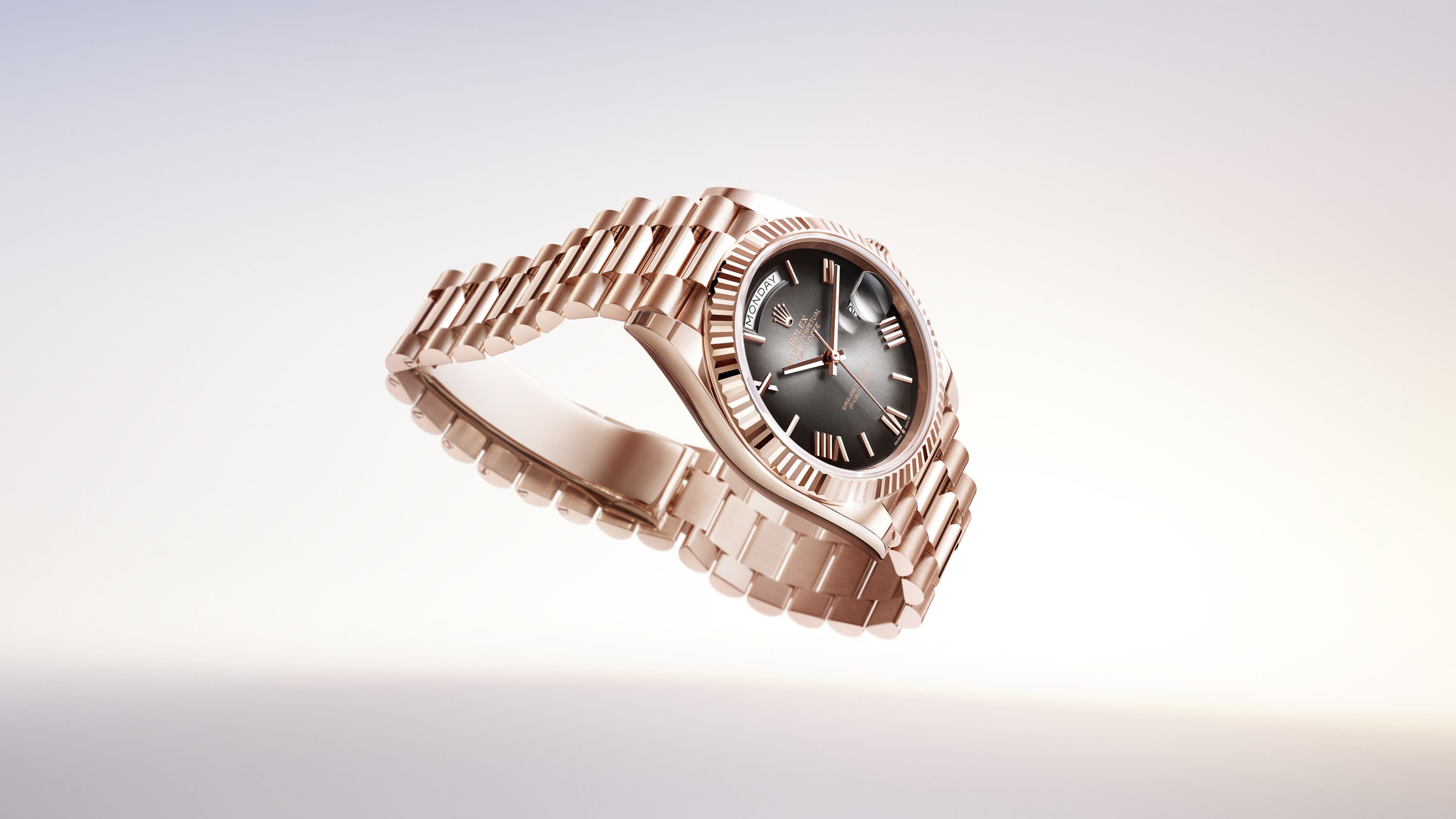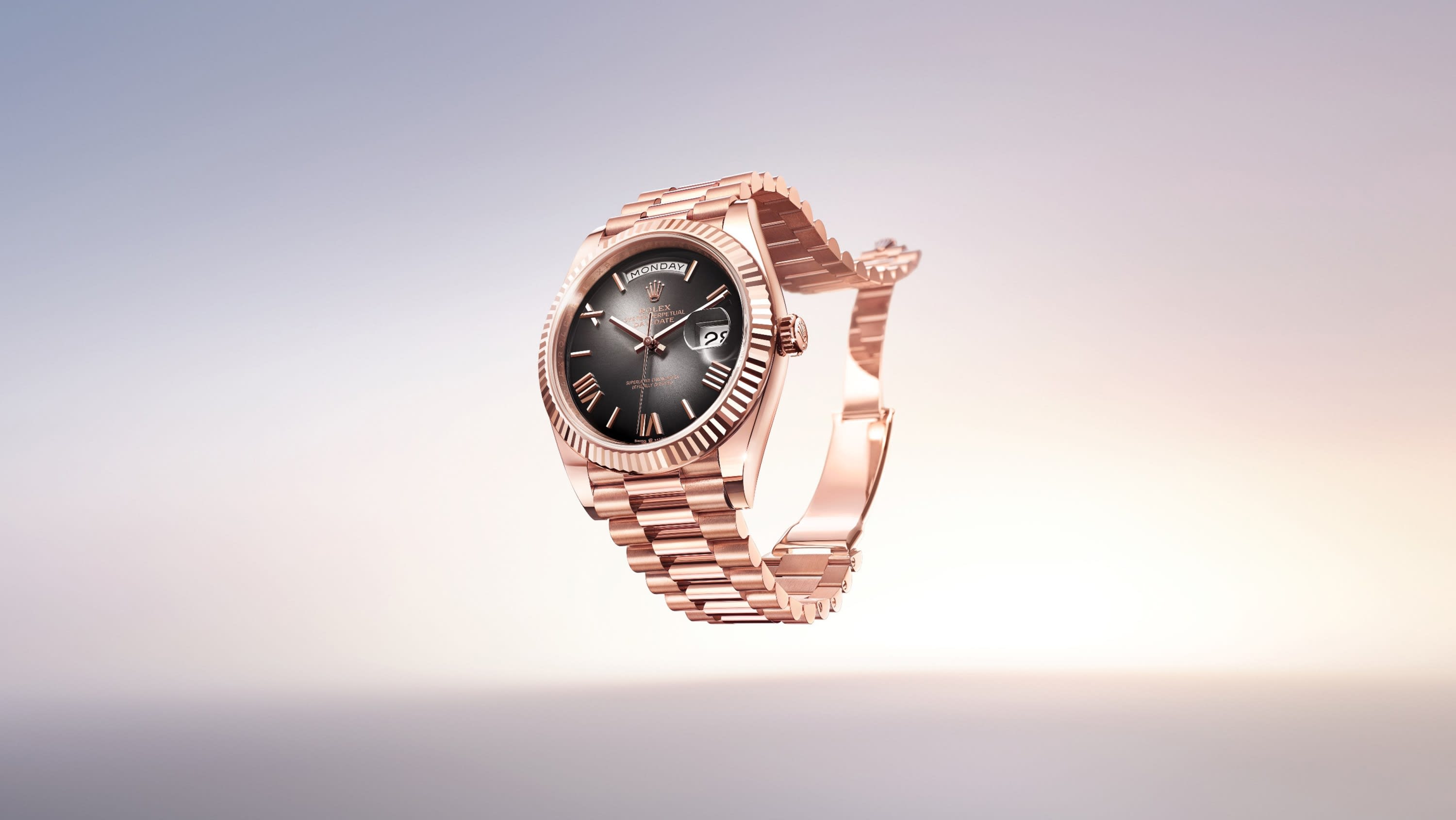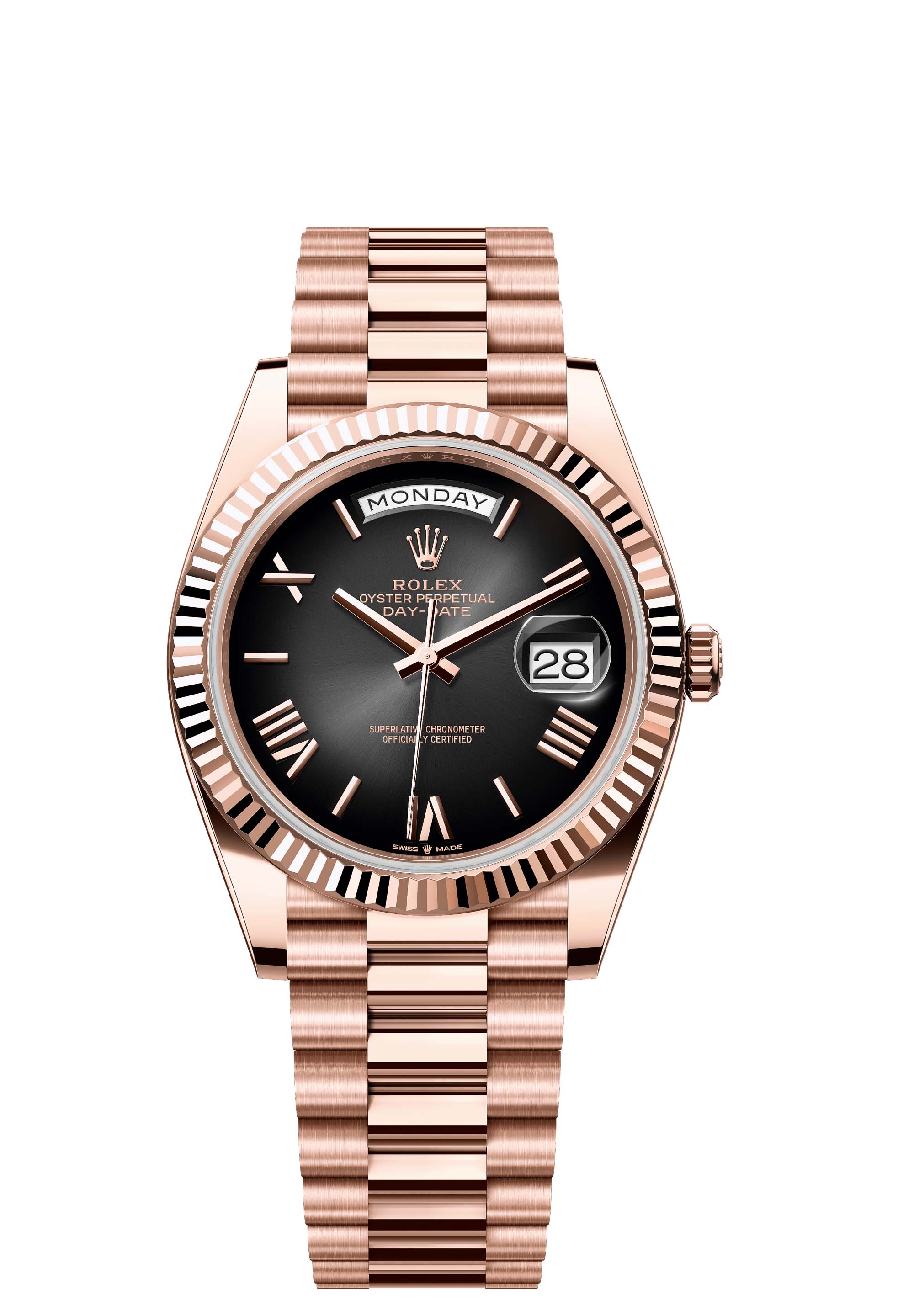 The Oyster Perpetual Day-Date 40 in 18 ct Everose gold with a slate ombré dial, fluted bezel and a President bracelet.