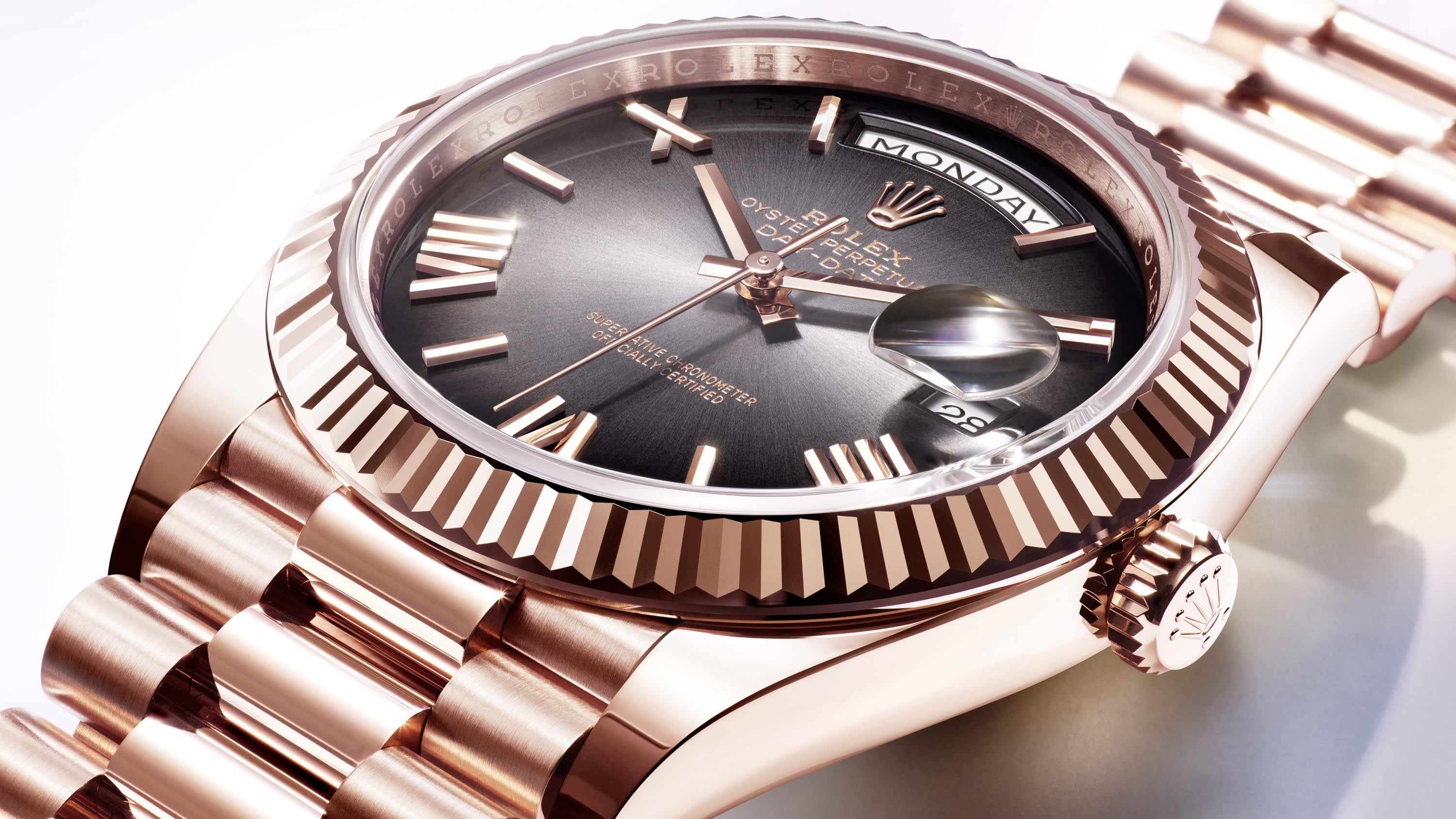 The Rolex fluted bezel is a mark of distinction. Originally, the fluting of the Oyster bezel had a functional purpose: it served to screw the bezel onto the case helping to ensure the waterproofness of the watch. It was therefore identical to the fluting on the case back, which was also screwed onto the case for waterproofness, using specific Rolex tools. Over time, the fluting became an aesthetic element, a genuine Rolex signature feature. Today the fluted bezel is a mark of distinction, in gold on this Day-Date 40.