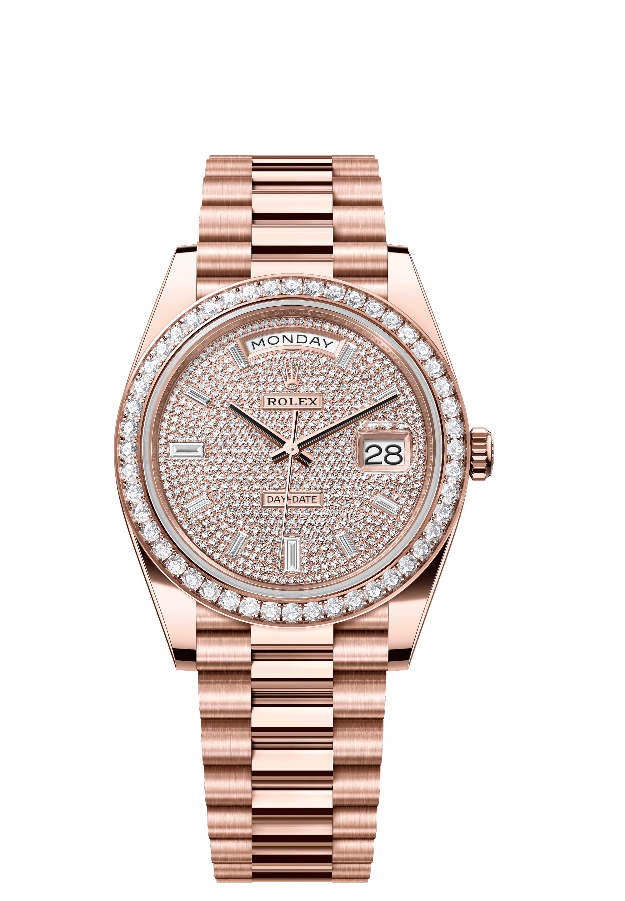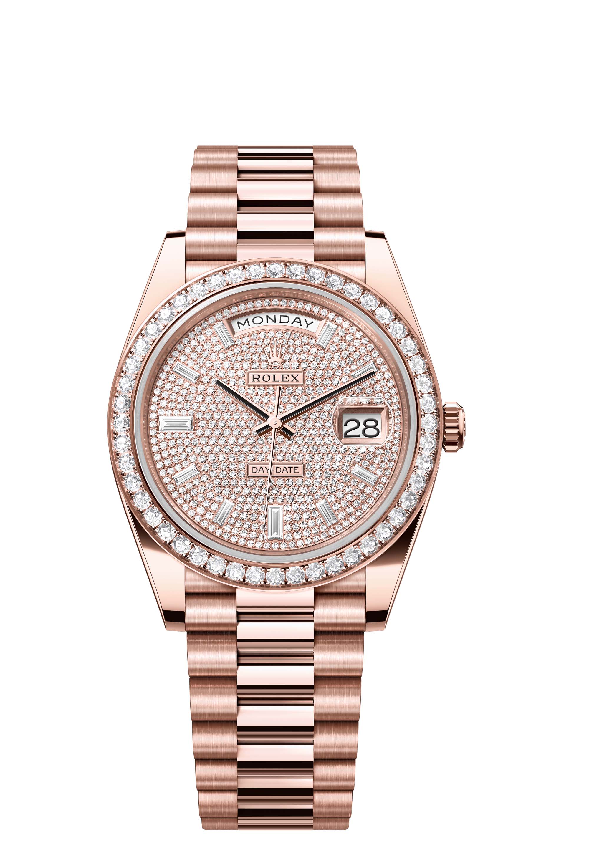The Oyster Perpetual Day-Date 40 in 18 ct Everose gold, with a diamond-paved dial, diamond-set bezel and a President bracelet.