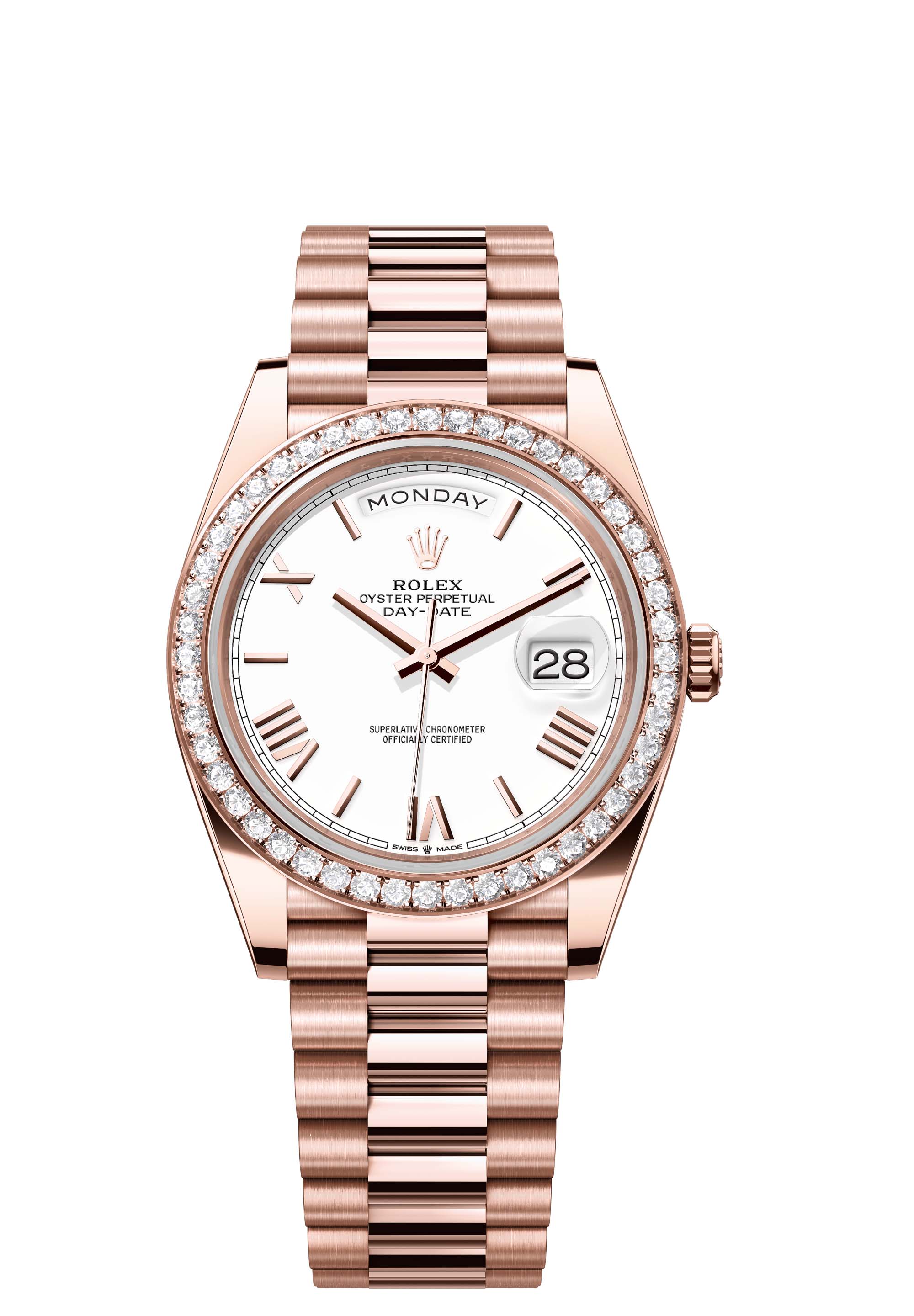 The Oyster Perpetual Day-Date 40 in 18 ct Everose gold with a white dial, diamond-set bezel and a President bracelet.