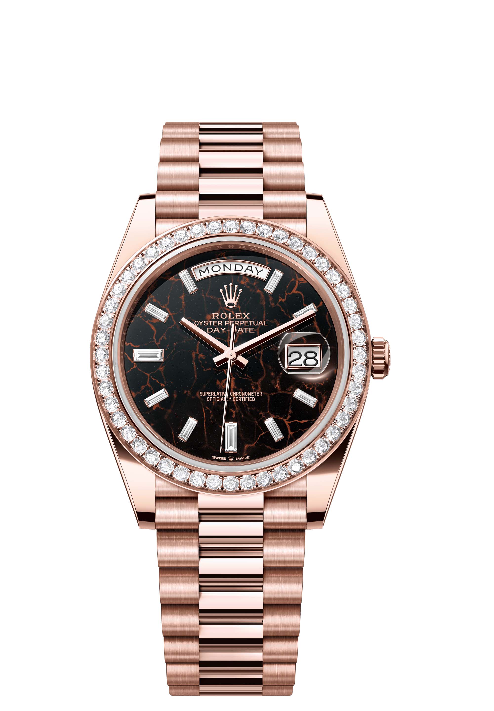 This dial features 10 baguette-cut diamonds. The Oyster Perpetual Day-Date 40 is presented with a dial made from eisenkiesel, a deep brown decorative stone used by the brand for the first time in 2021. Eisenkiesel is an iron-oxide, delicately veined quartz. The stone discs destined for the dials are cut from a block of raw material. Only those whose colour and structure fully satisfy the brand’s exacting aesthetic requirements are selected. They will grace the dial of a Rolex watch, conferring it with a unique personality.