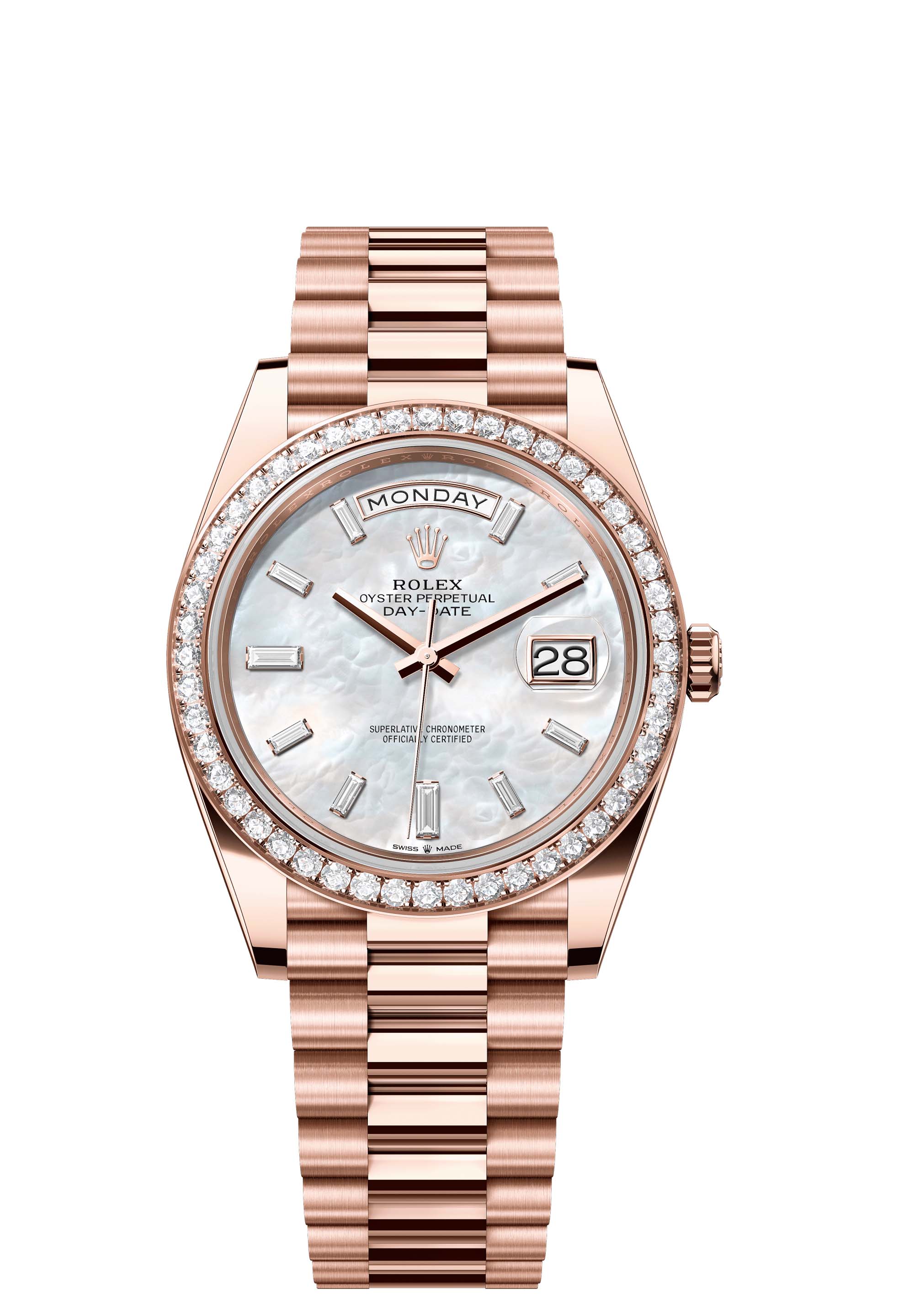 The Oyster Perpetual Day-Date 40 in 18 ct Everose gold, with a white mother-of-pearl, diamond-set dial, diamond-set bezel and a President bracelet.