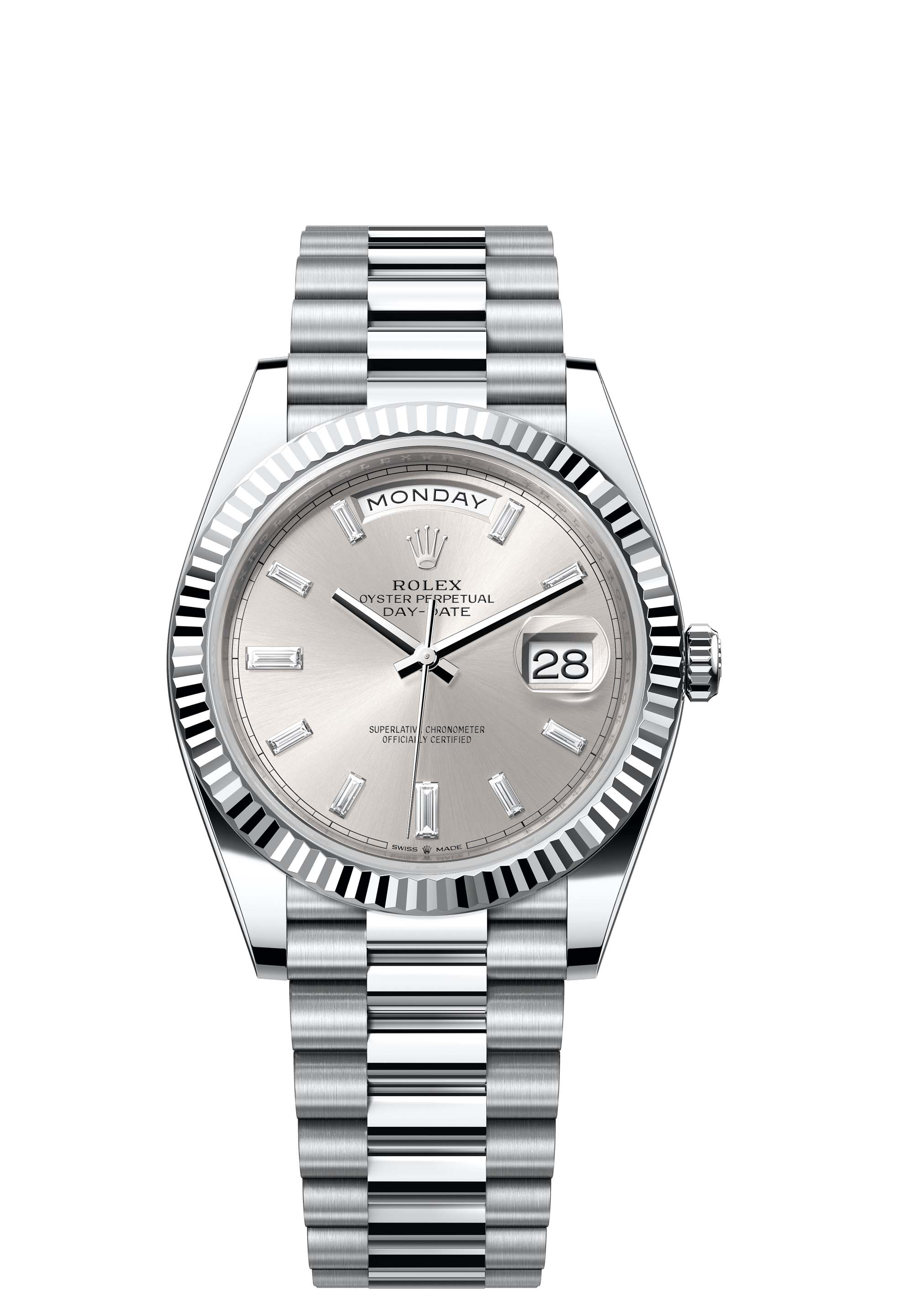 The Oyster Perpetual Day-Date 40 in platinum with a silver, diamond-set dial, fluted bezel and a President bracelet.
