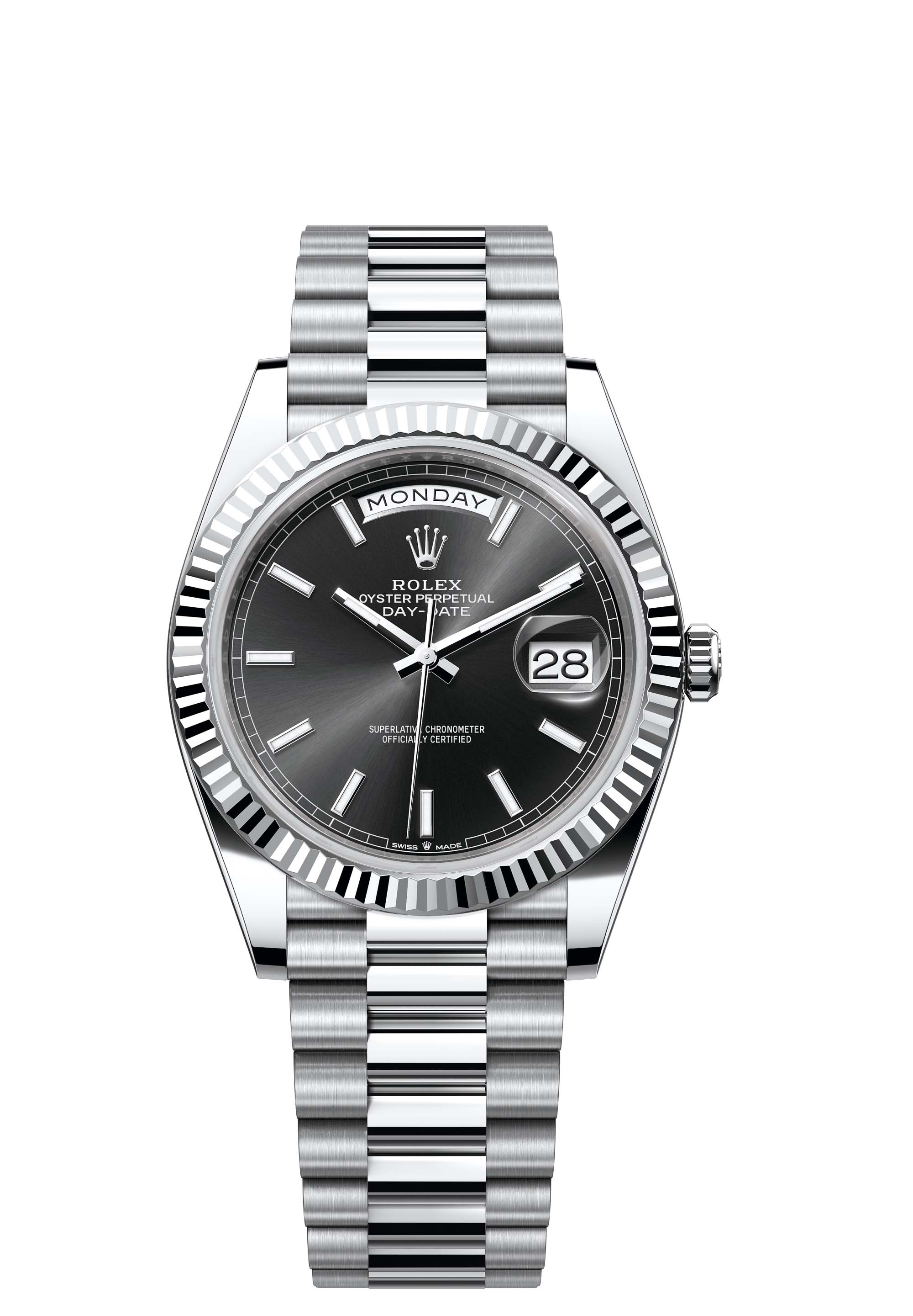 The Oyster Perpetual Day-Date 40 in platinum with a bright black dial, fluted bezel and a President bracelet.