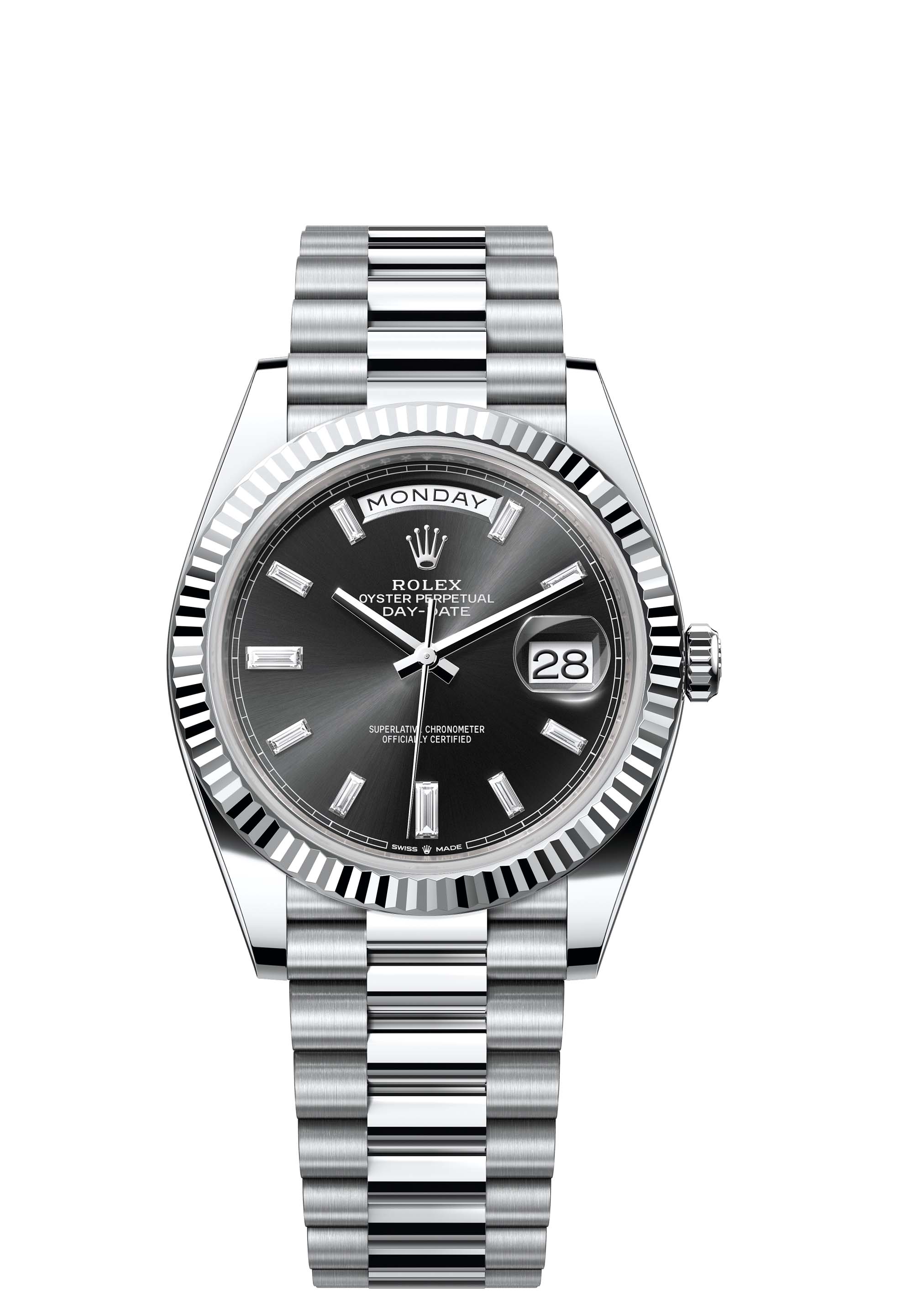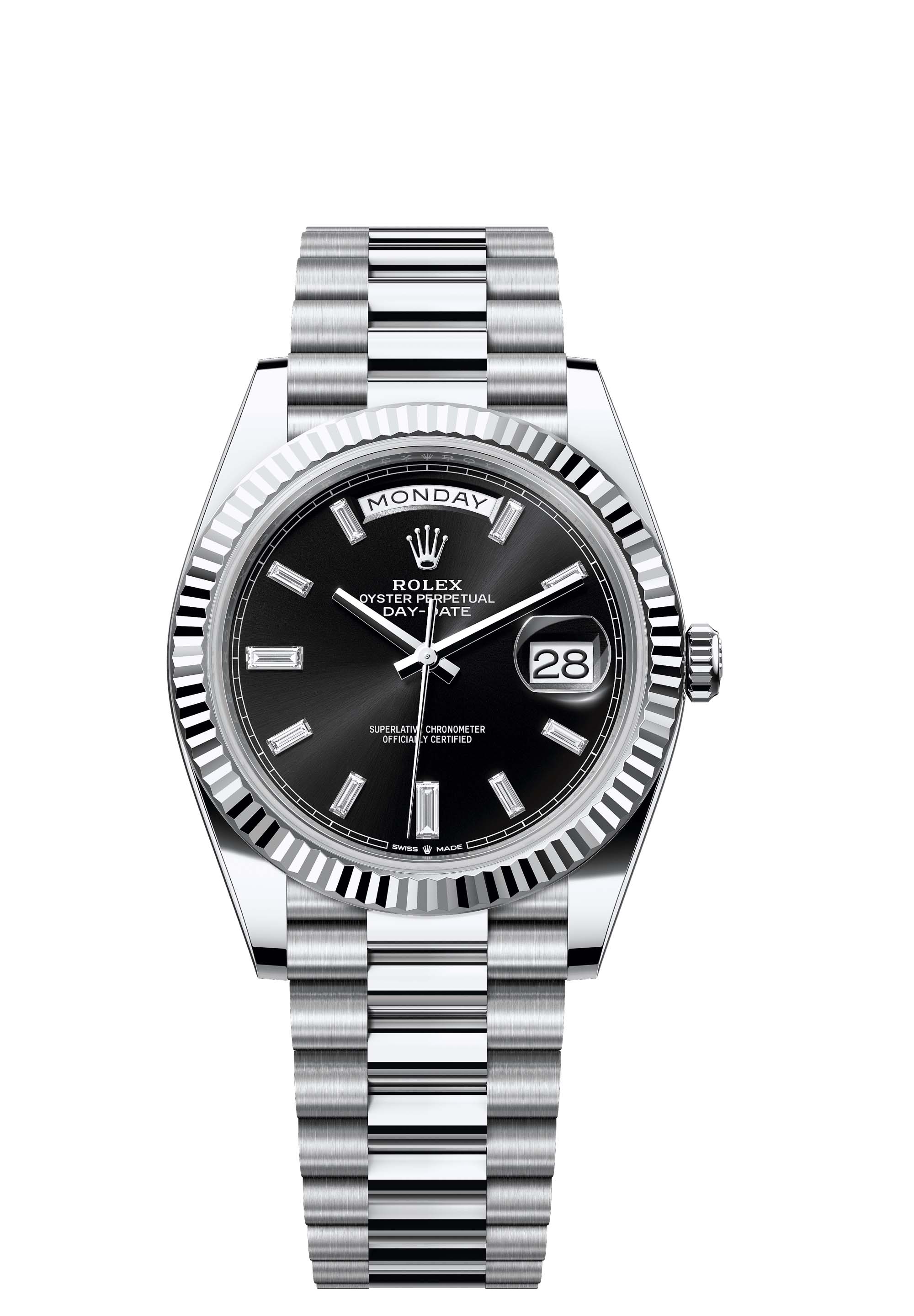 The Oyster Perpetual Day-Date 40 in platinum with a bright black, diamond-set dial, fluted bezel and a President bracelet.