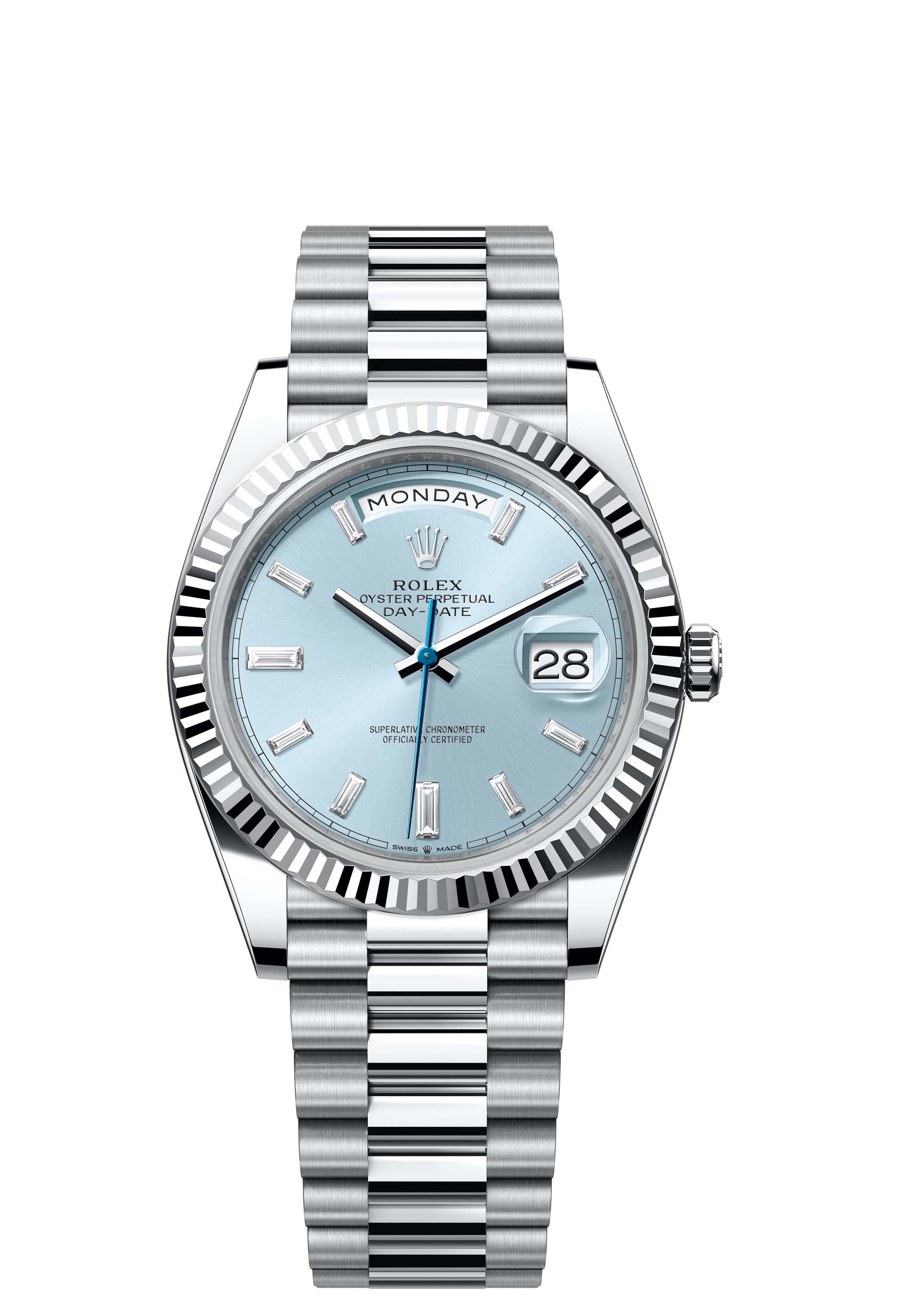 The Oyster Perpetual Day-Date 40 in platinum with an ice-blue, diamond-set dial, fluted bezel and a President bracelet.