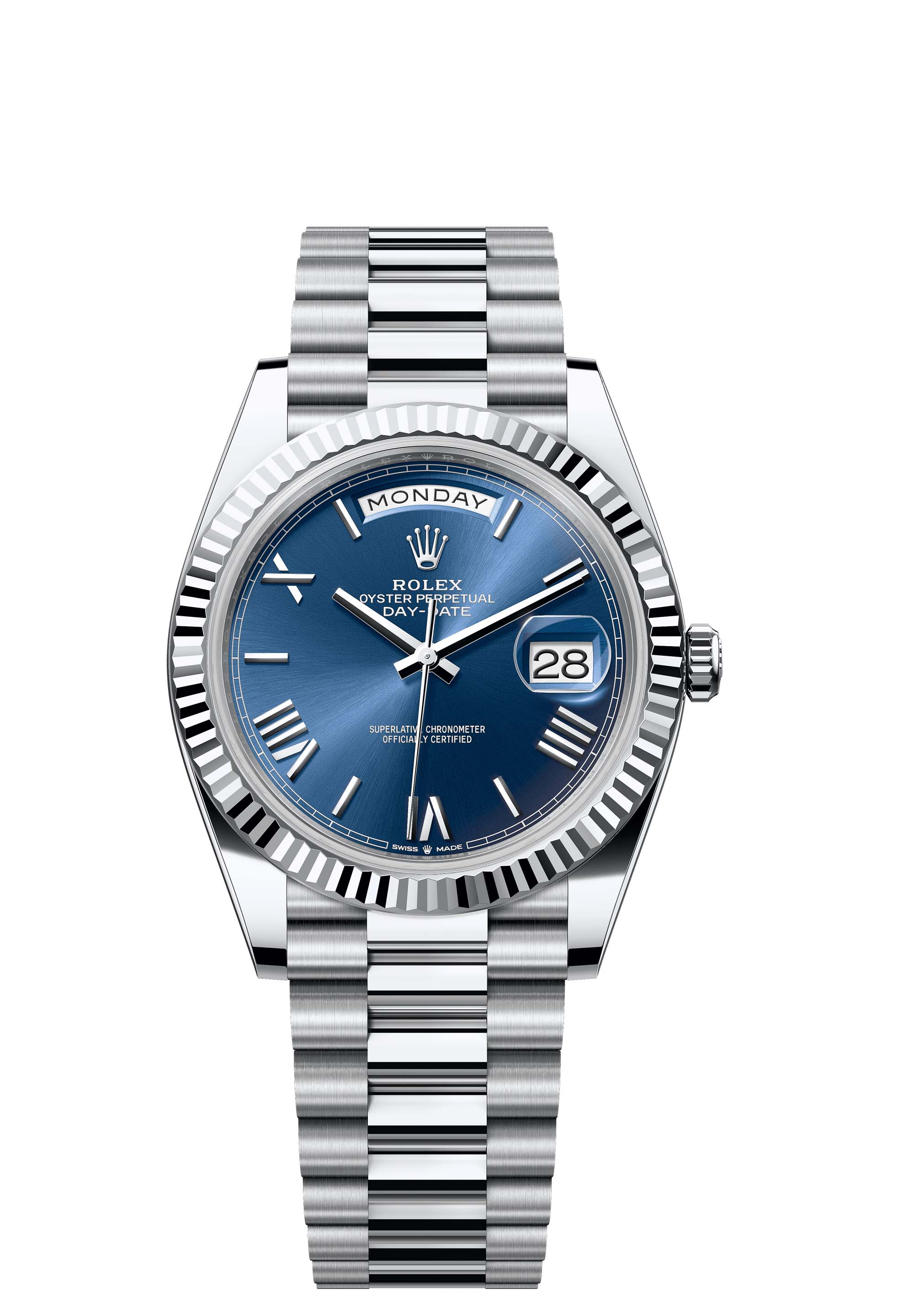The Oyster Perpetual Day-Date 40 in platinum with a bright blue dial, fluted bezel and a President bracelet.