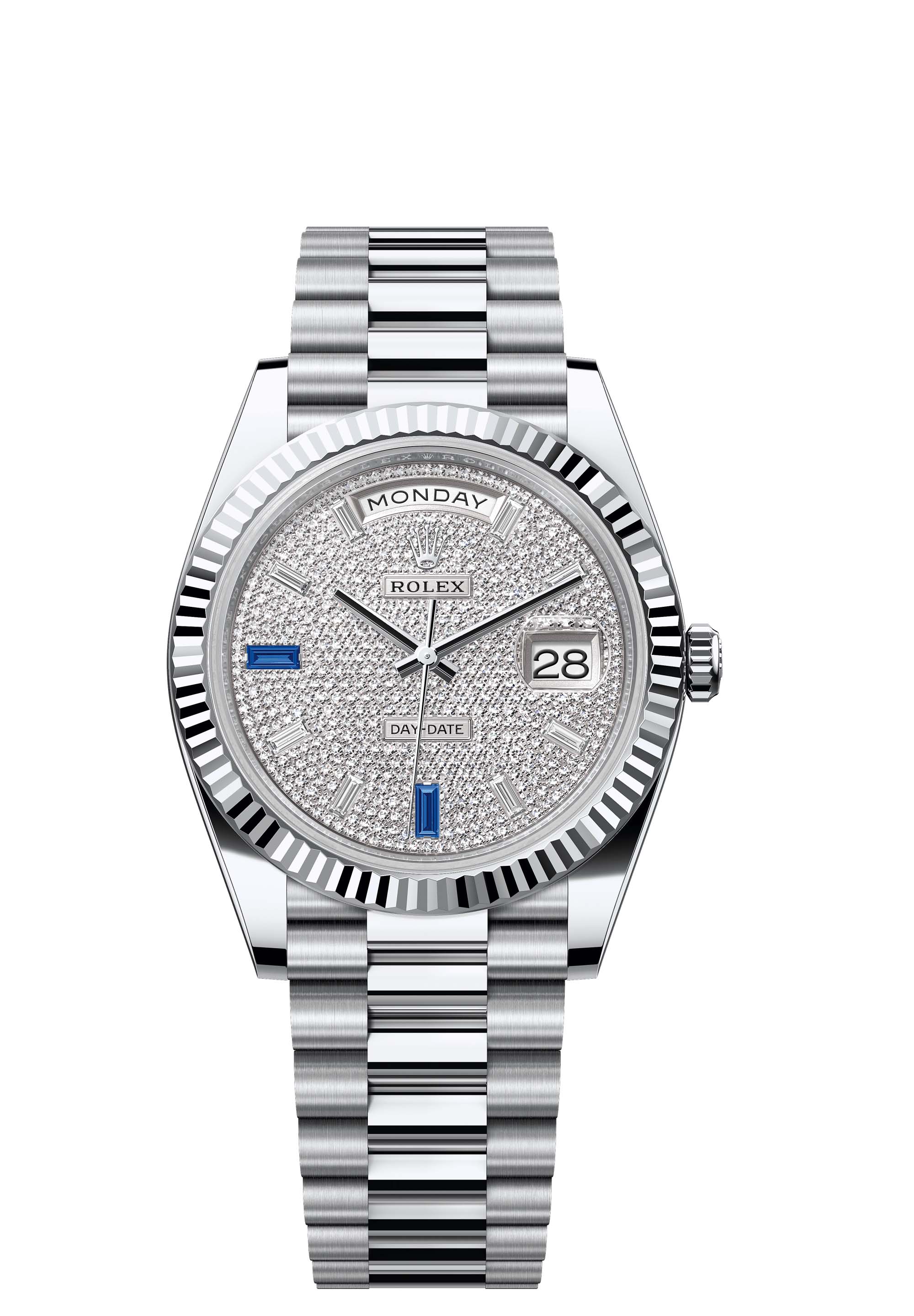 The Oyster Perpetual Day-Date 40 in platinum with a diamond-paved dial, fluted bezel and a President bracelet.