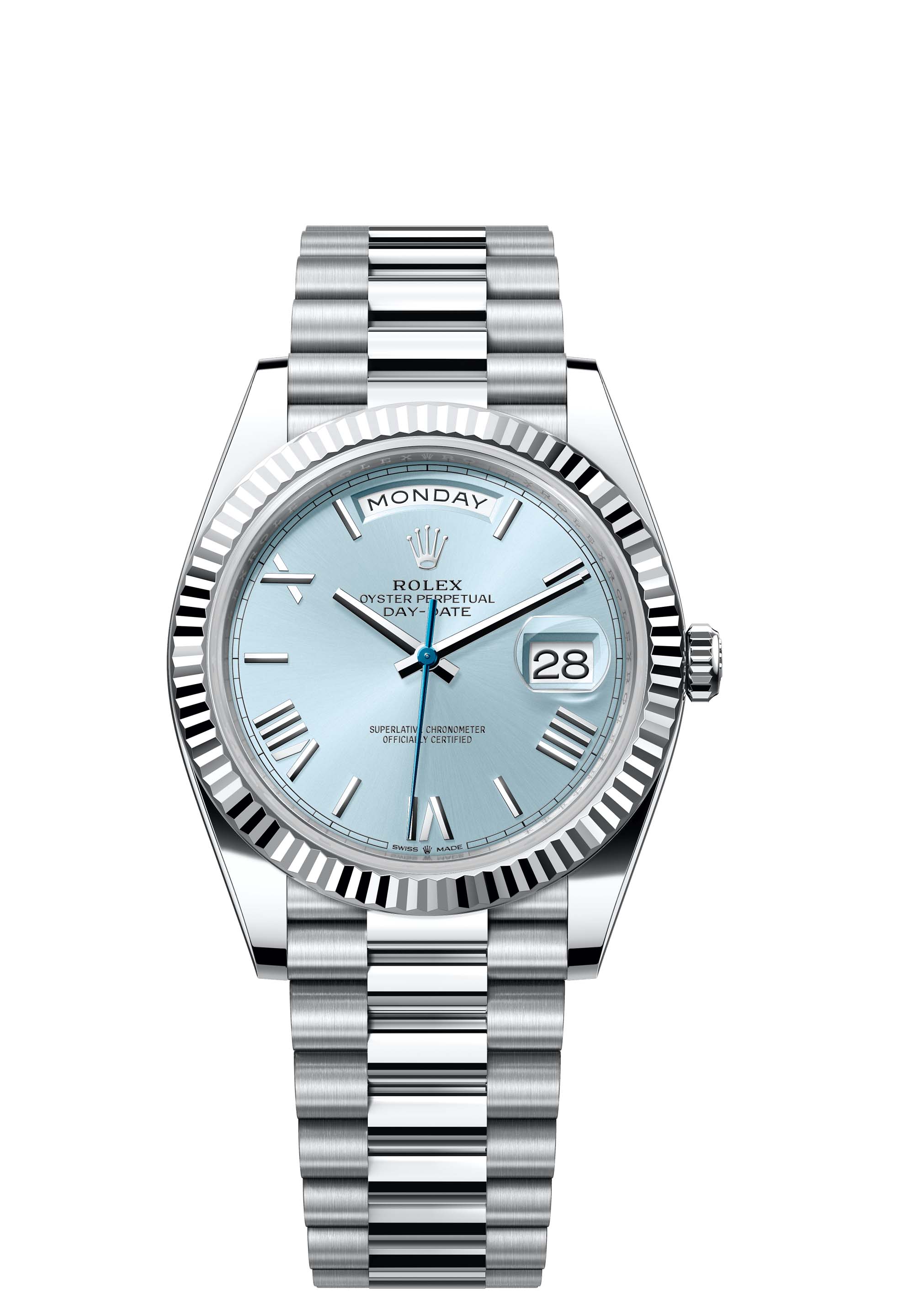 The Oyster Perpetual Day-Date 40 in platinum with an ice-blue dial, fluted bezel and a President bracelet.