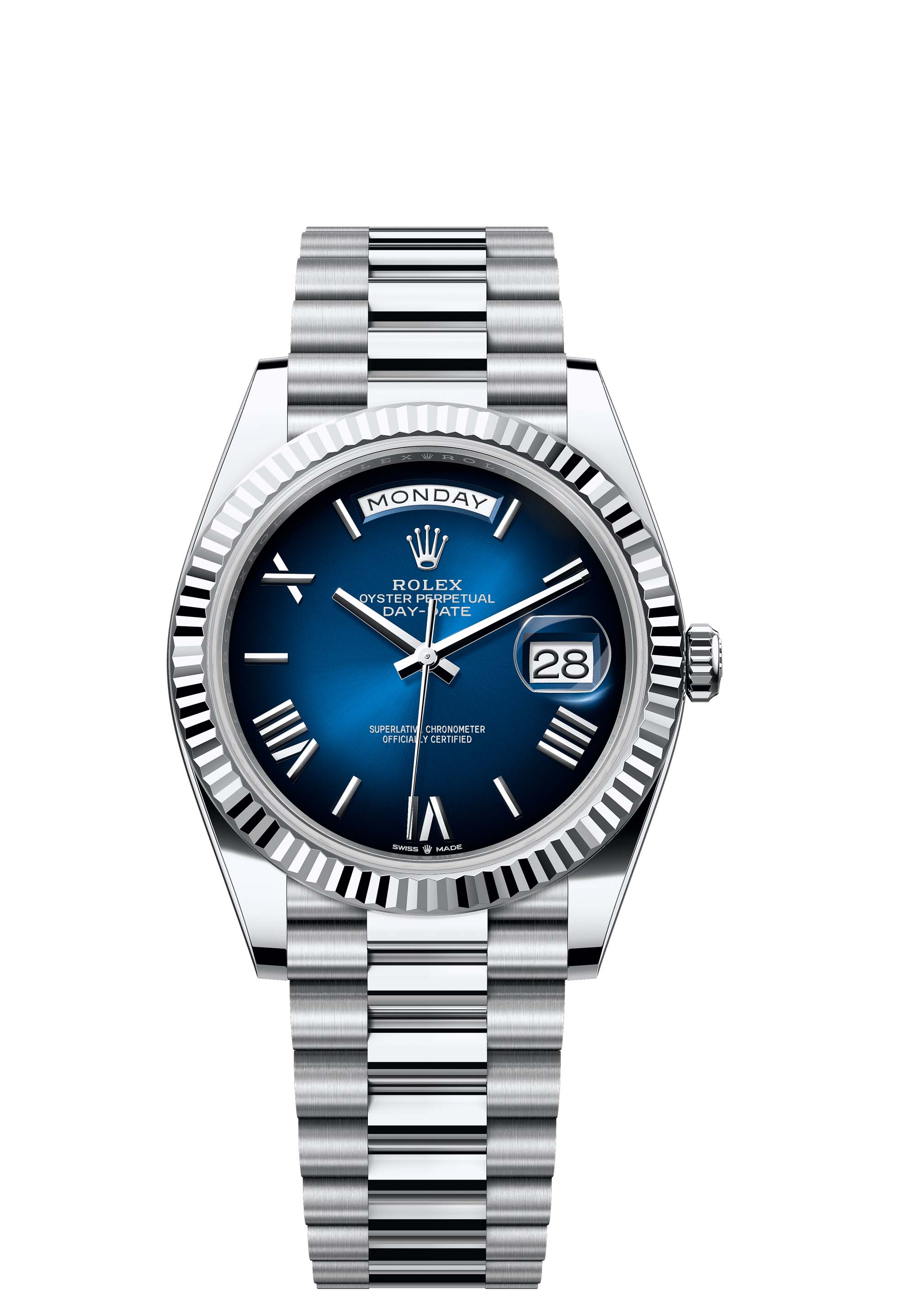 The Oyster Perpetual Day-Date 40 in platinum with a blue ombré dial, fluted bezel and a President bracelet.