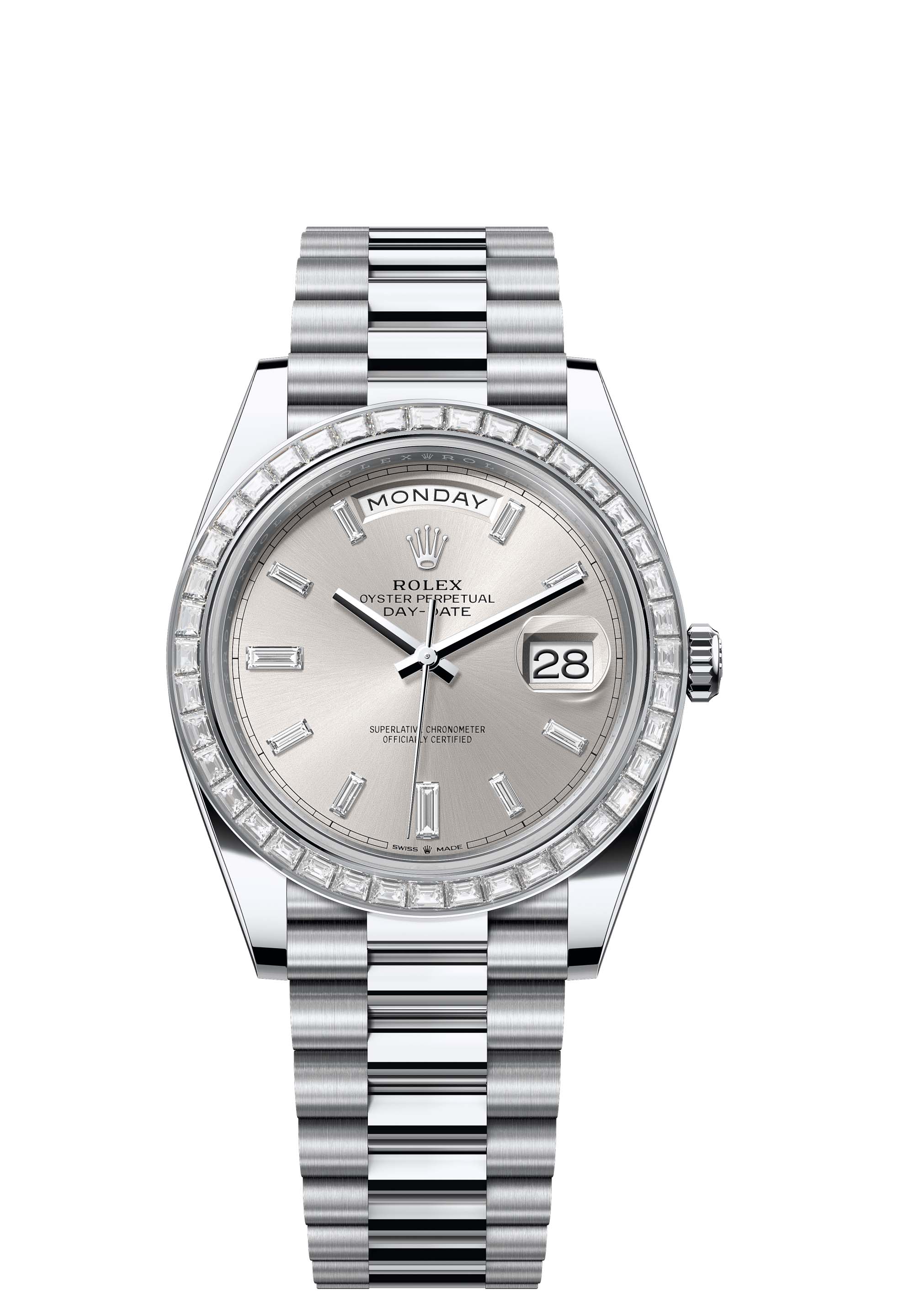 The Oyster Perpetual Day-Date 40 in platinum, with a silver, diamond-set dial, diamond-set bezel and a President bracelet.
