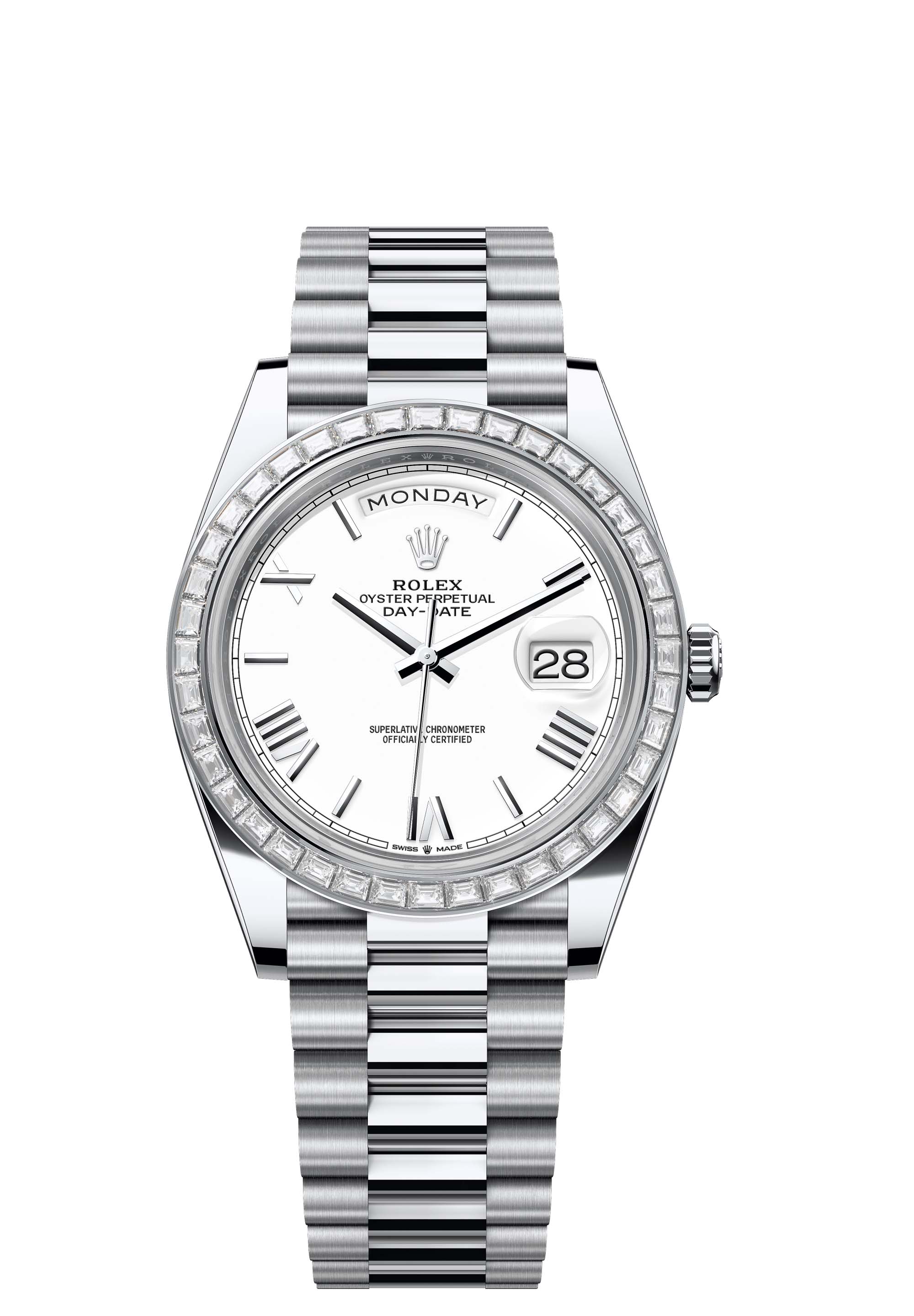 The Oyster Perpetual Day-Date 40 in platinum with a white dial, diamond-set bezel and a President bracelet.
