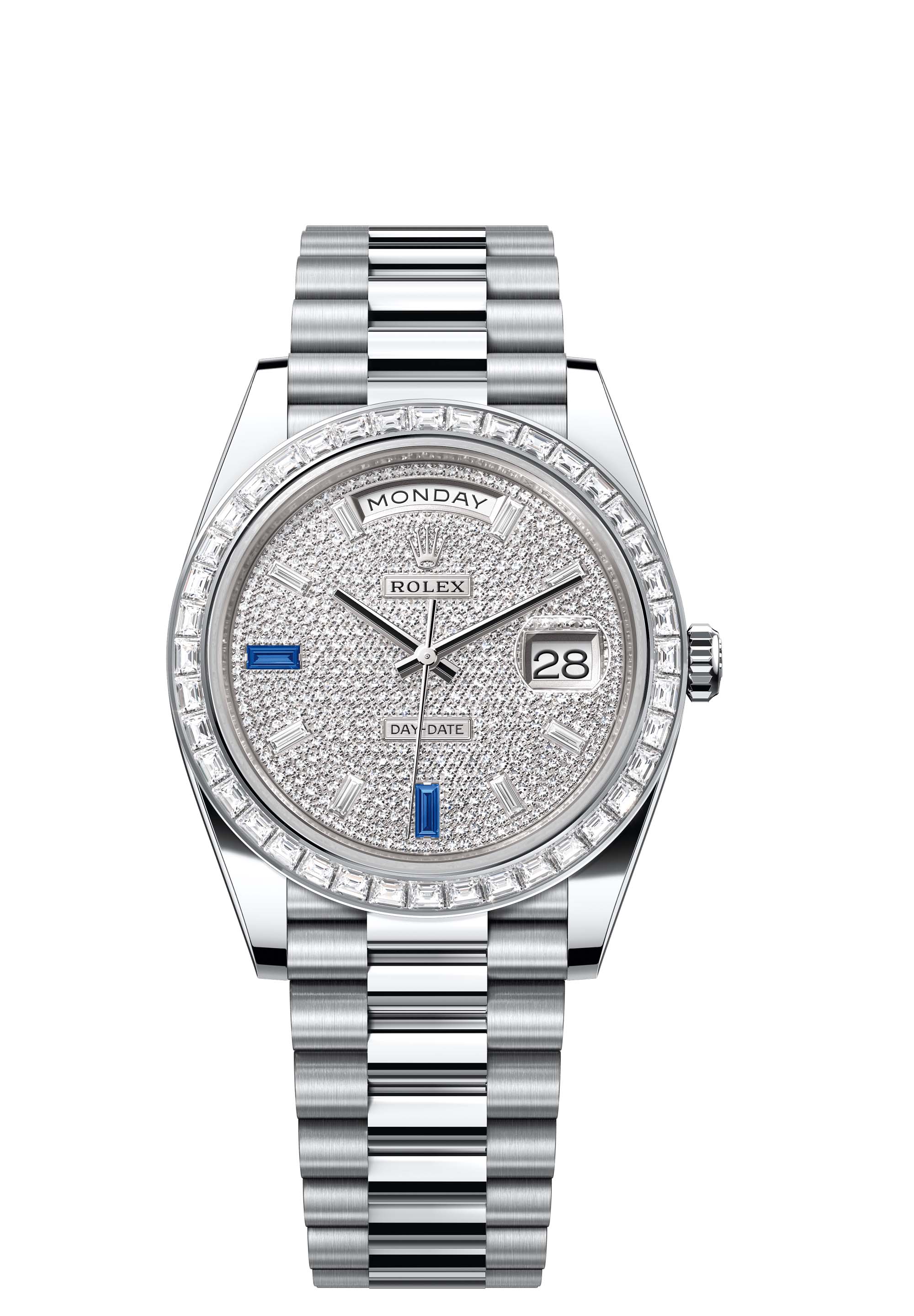The Oyster Perpetual Day-Date 40 in platinum, with a diamond-paved dial, diamond-set bezel and a President bracelet.
