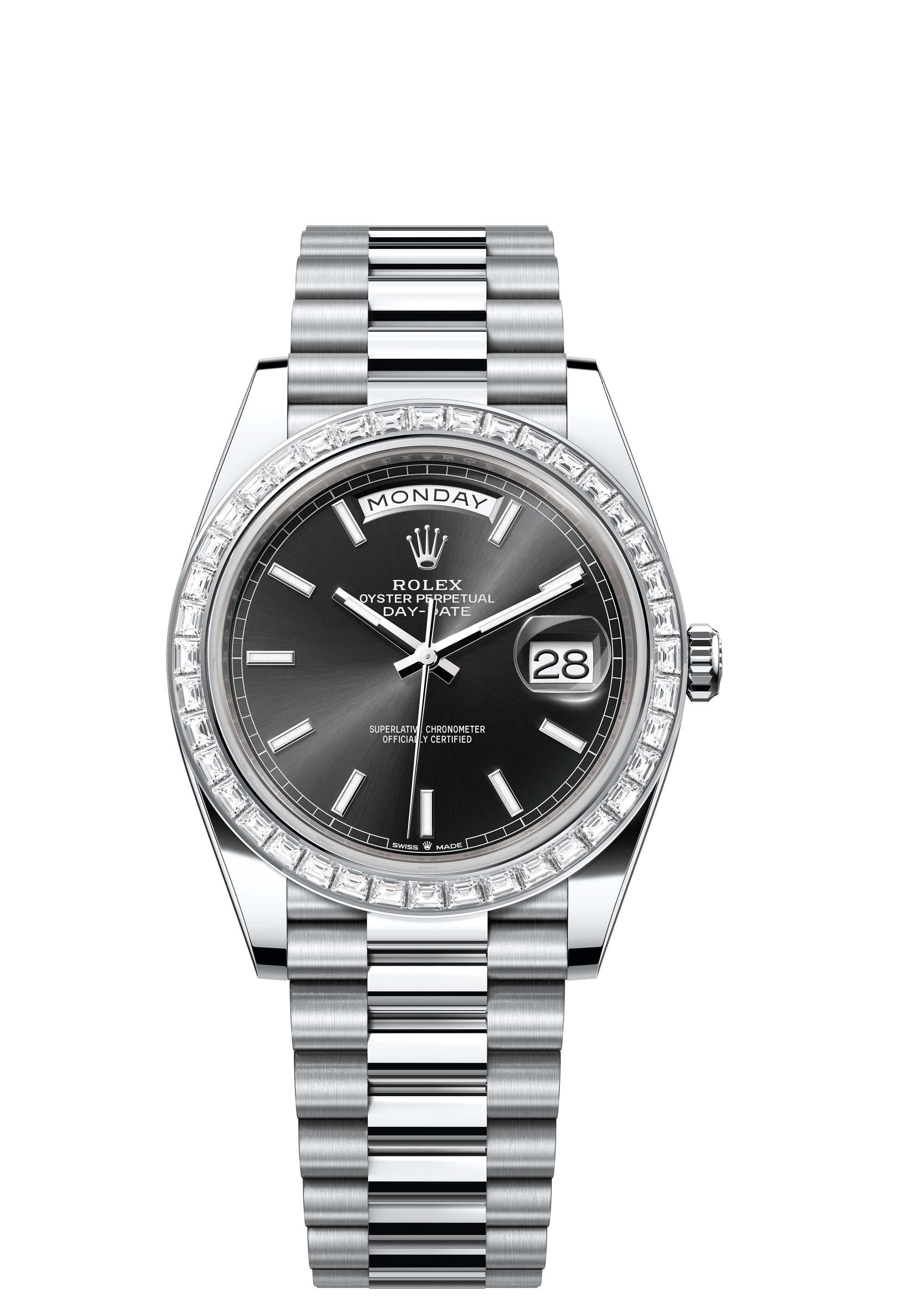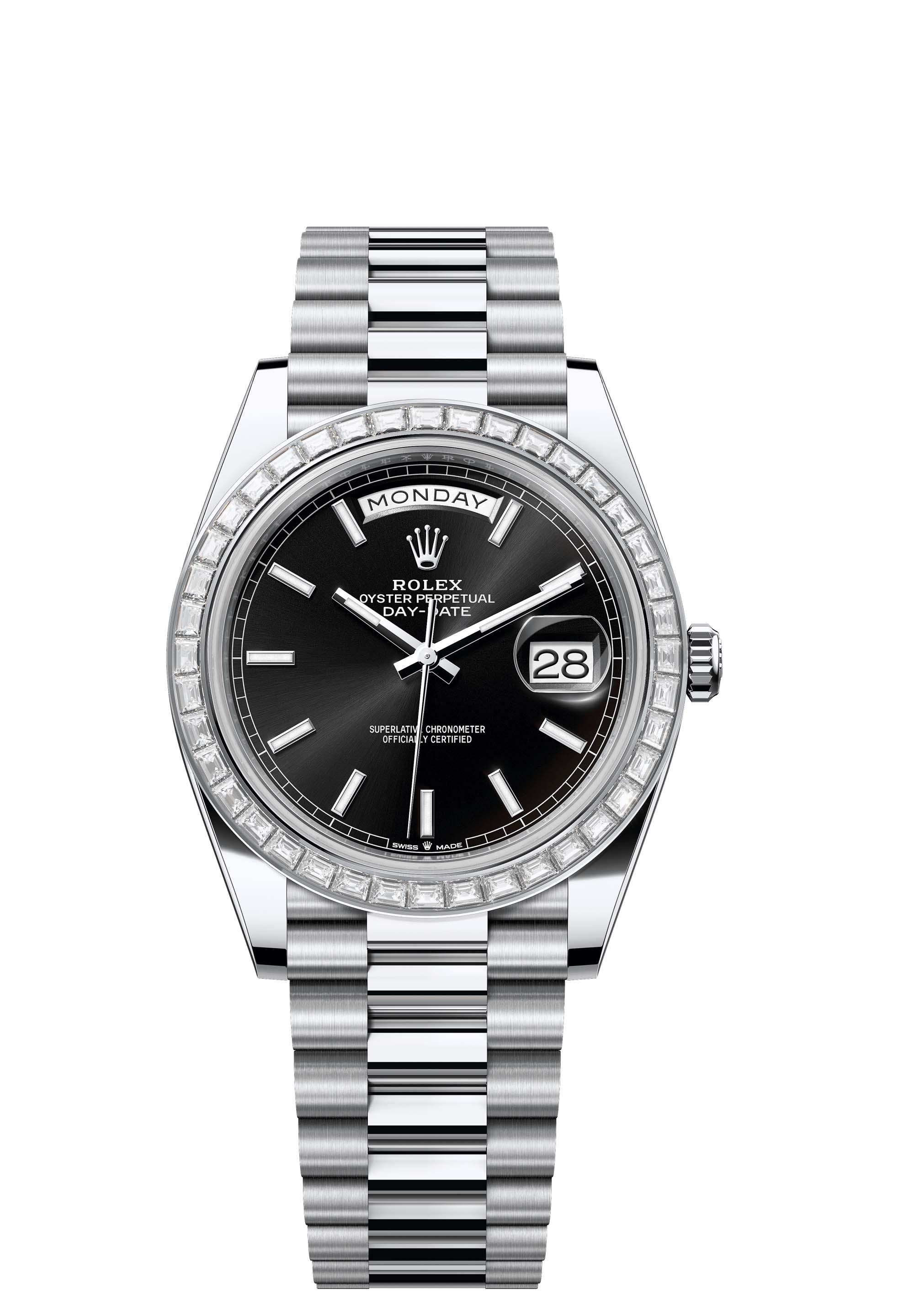 The Oyster Perpetual Day-Date 40 in platinum with a bright black dial, diamond-set bezel and a President bracelet.