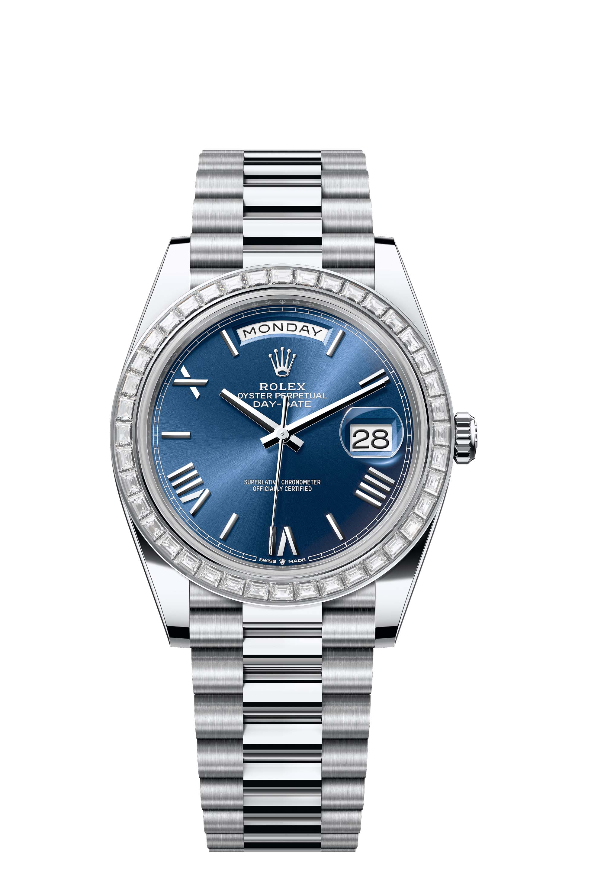 The Oyster Perpetual Day-Date 40 in platinum with a bright blue dial, diamond-set bezel and a President bracelet.