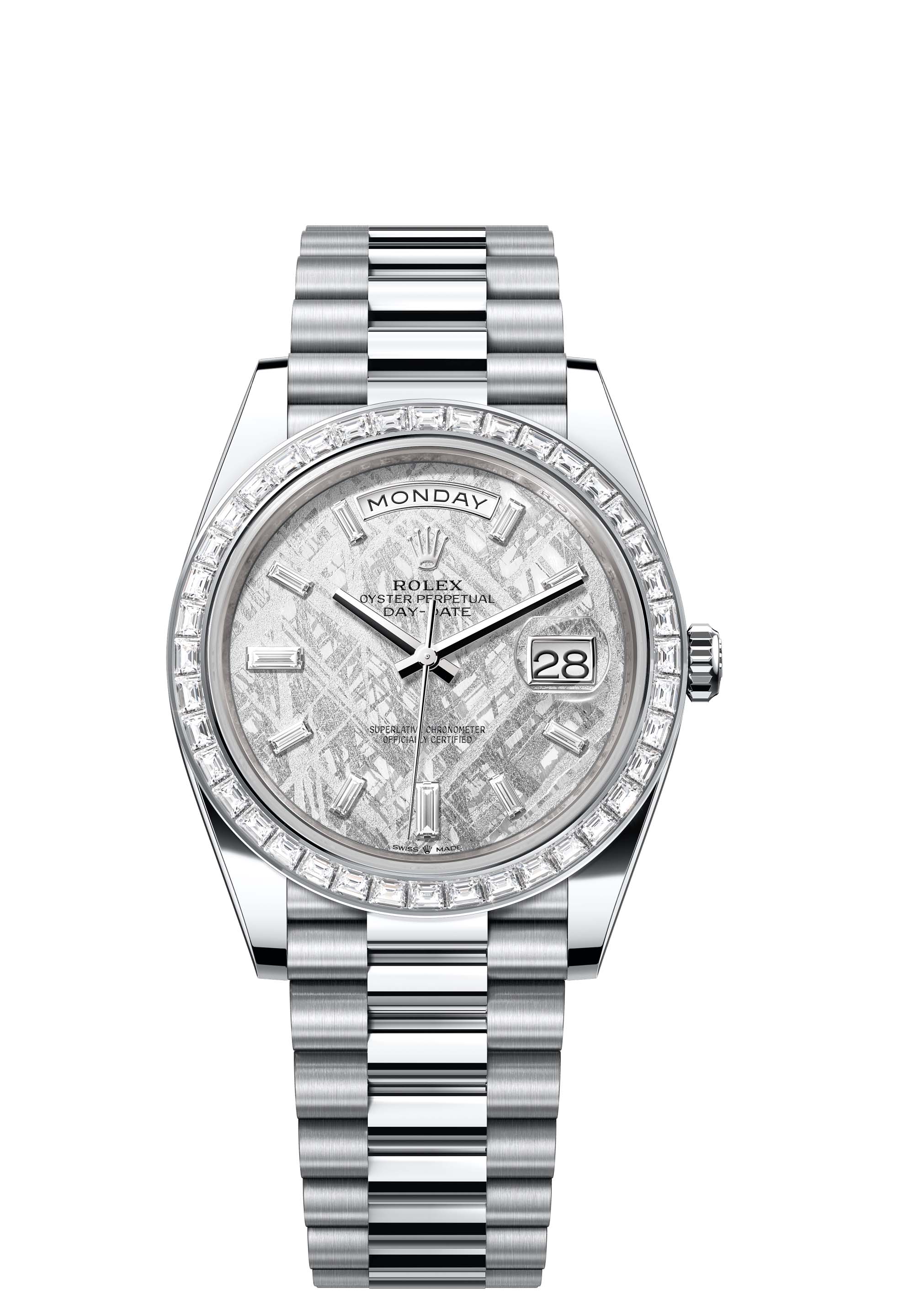 The Oyster Perpetual Day-Date 40 in platinum, with a meteorite, diamond-set dial, diamond-set bezel and a President bracelet.