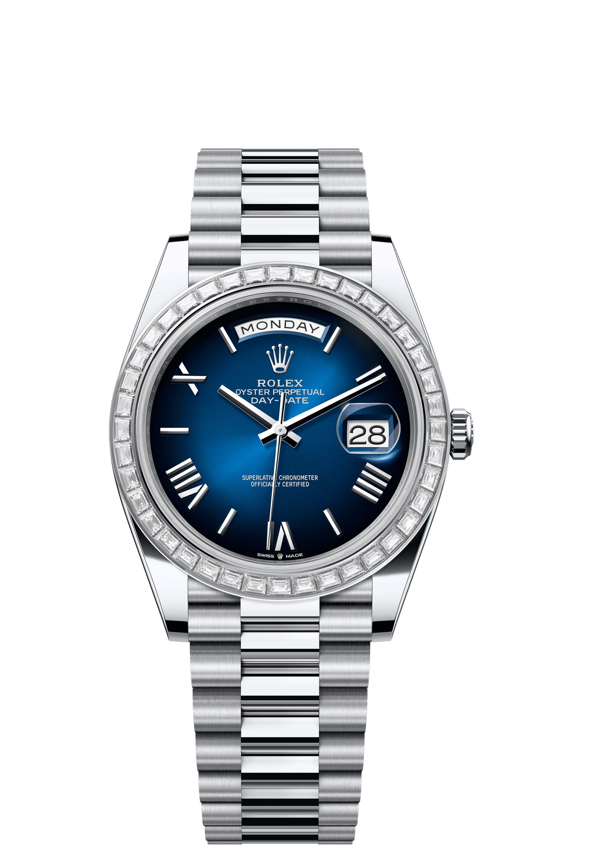The Oyster Perpetual Day-Date 40 in platinum with a blue ombré dial, diamond-set bezel and a President bracelet.