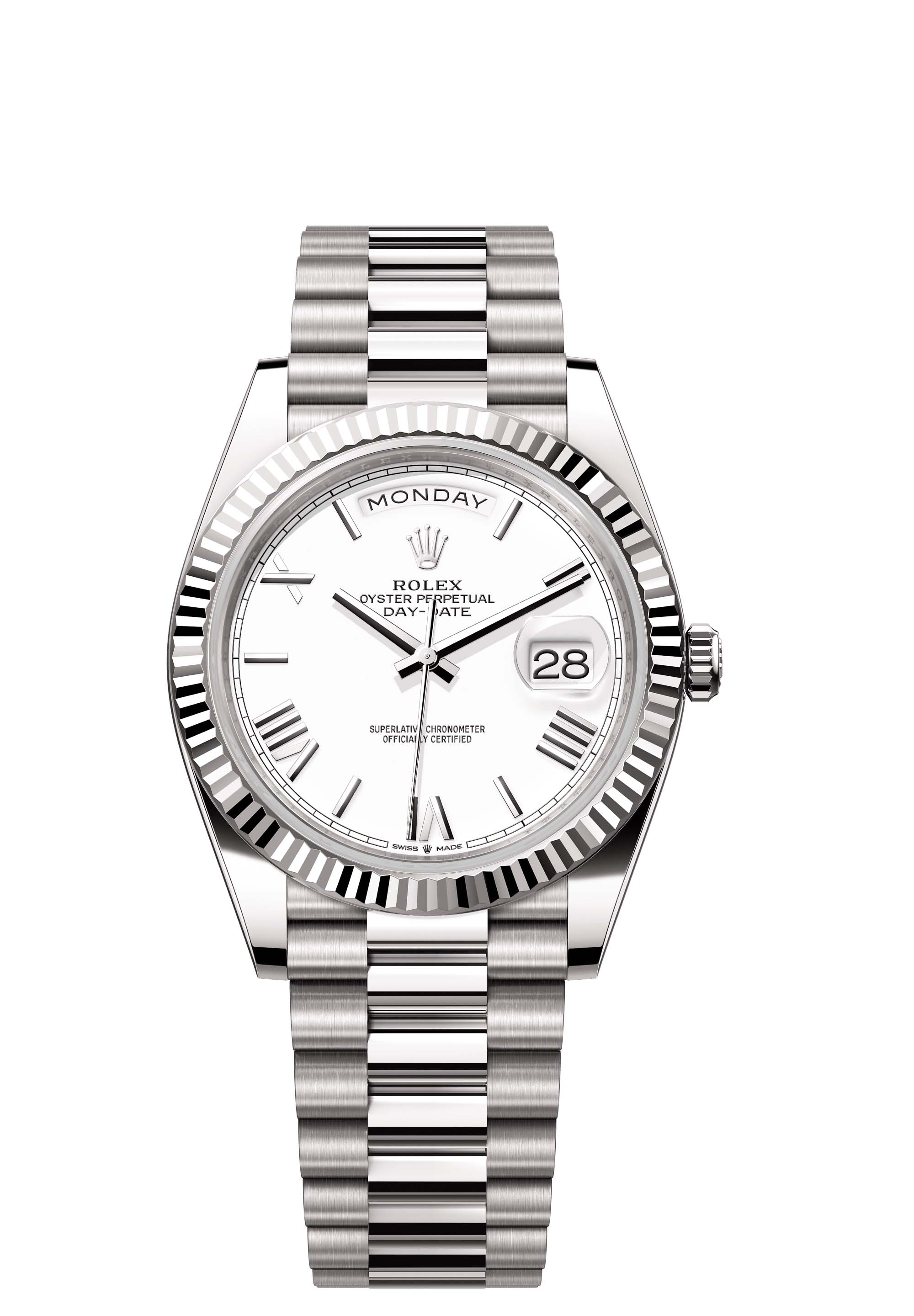 The Oyster Perpetual Day-Date 40 in 18 ct white gold with a white dial, fluted bezel and a President bracelet.
