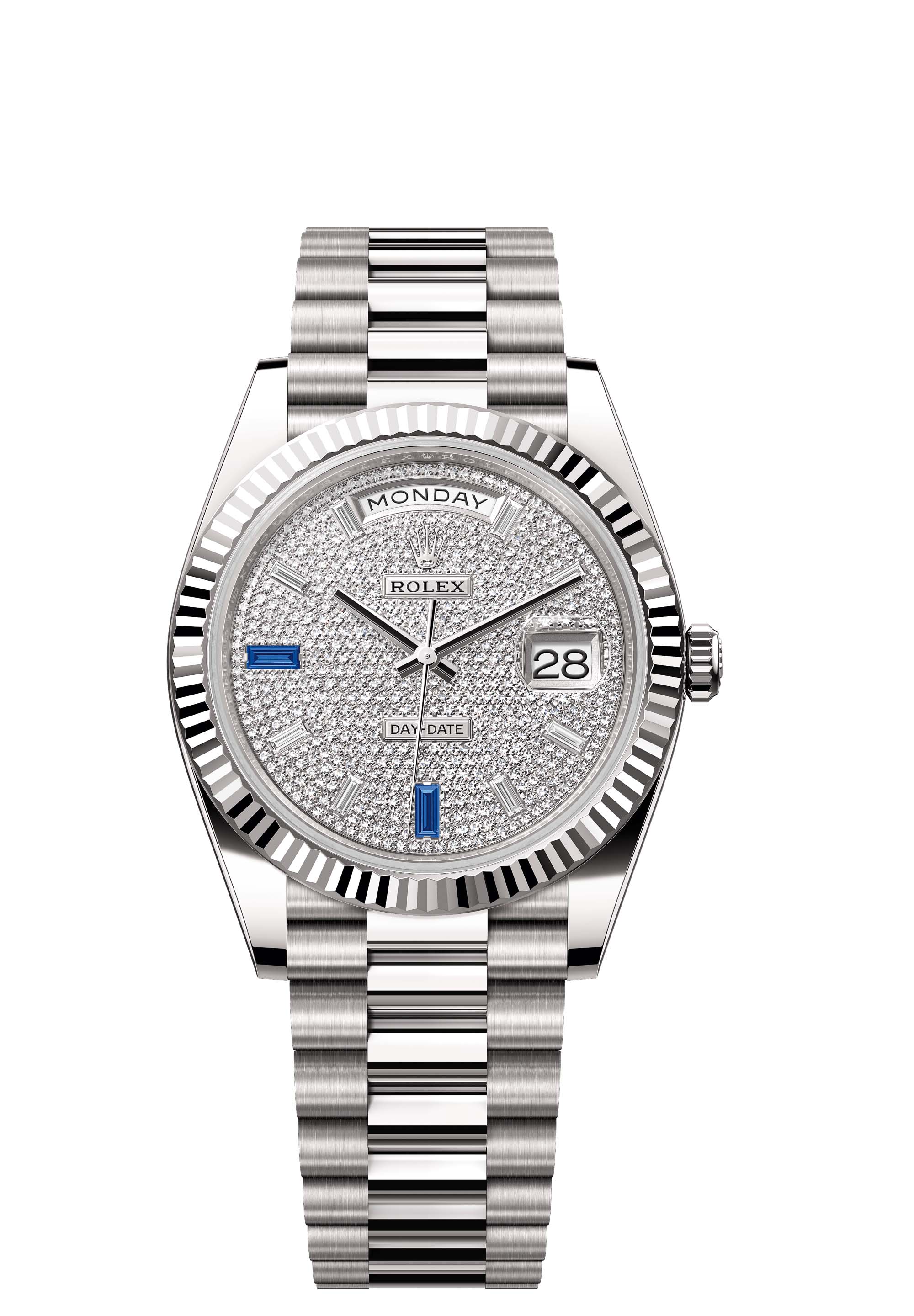 The Oyster Perpetual Day-Date 40 in 18 ct white gold with a diamond-paved dial, fluted bezel and a President bracelet.