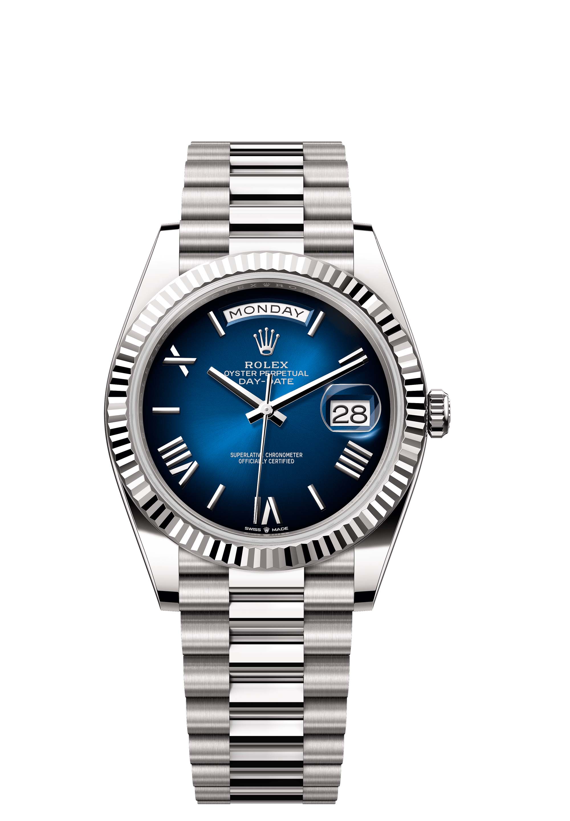 The Oyster Perpetual Day-Date 40 in 18 ct white gold with a blue ombré dial, fluted bezel and a President bracelet.