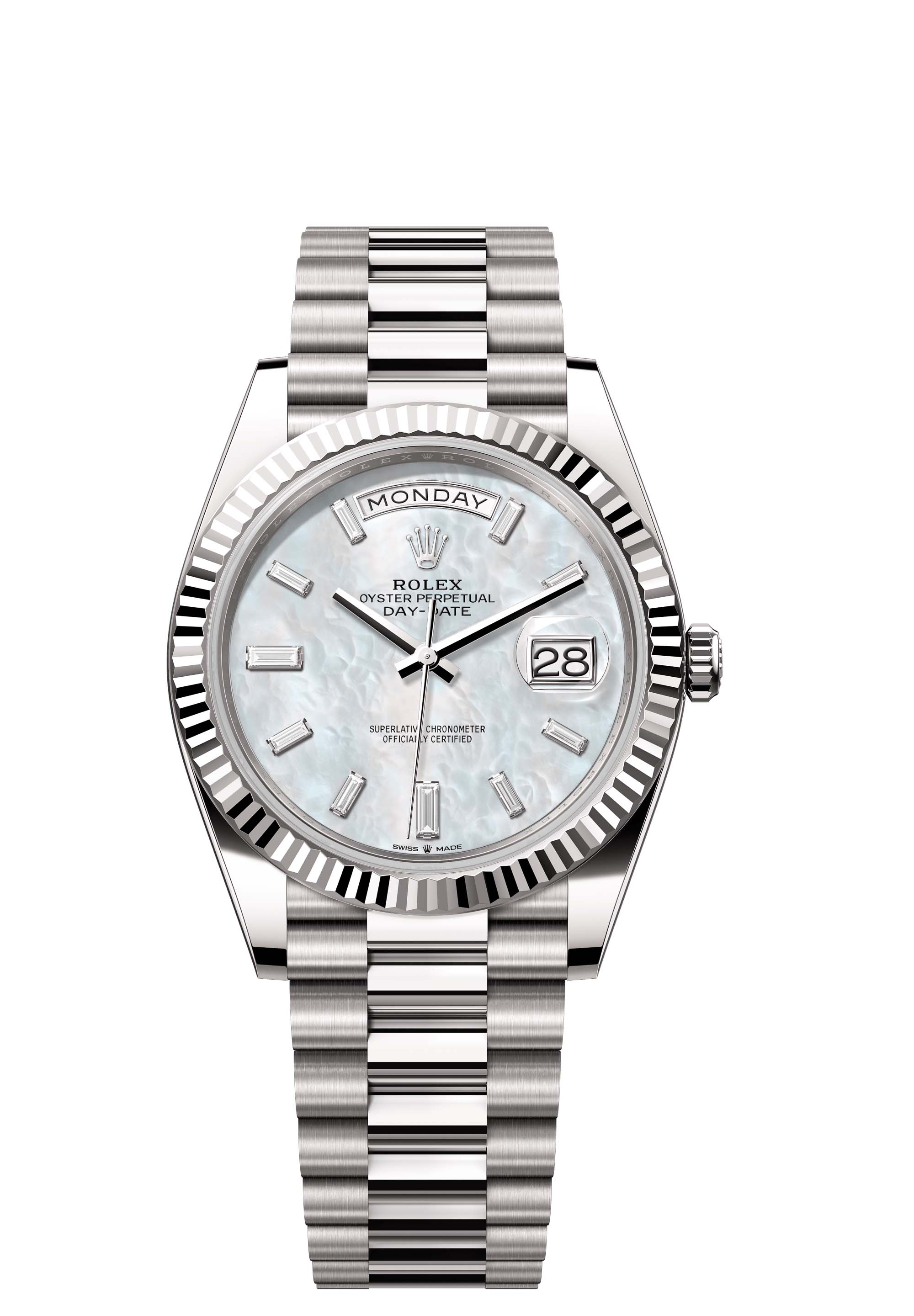 The Oyster Perpetual Day-Date 40 in 18 ct white gold with a white mother-of-pearl, diamond-set dial, fluted bezel and a President bracelet.