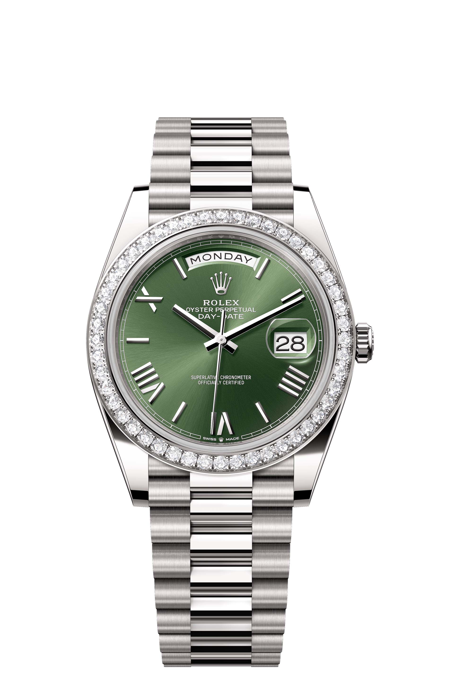 The Oyster Perpetual Day-Date 40 in 18 ct white gold with an olive-green dial, diamond-set bezel and a President bracelet.