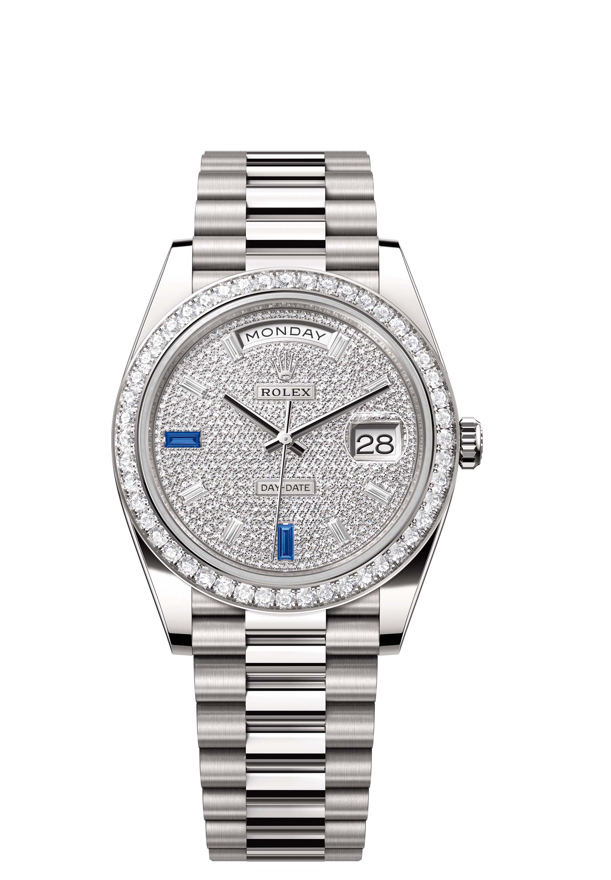The Oyster Perpetual Day-Date 40 in 18 ct white gold, with a diamond-paved dial, diamond-set bezel and a President bracelet.