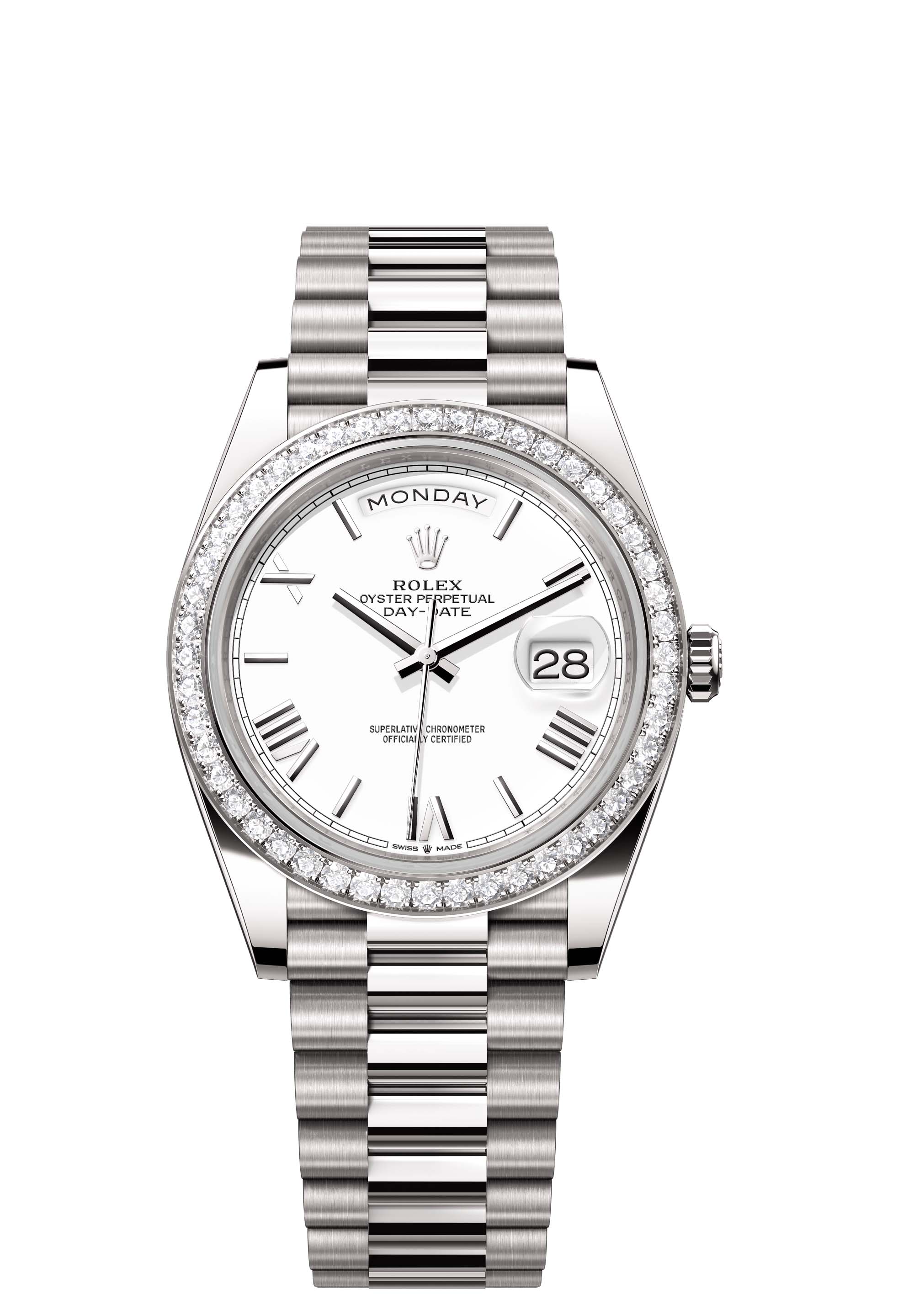 The Oyster Perpetual Day-Date 40 in 18 ct white gold with a white dial, diamond-set bezel and a President bracelet.