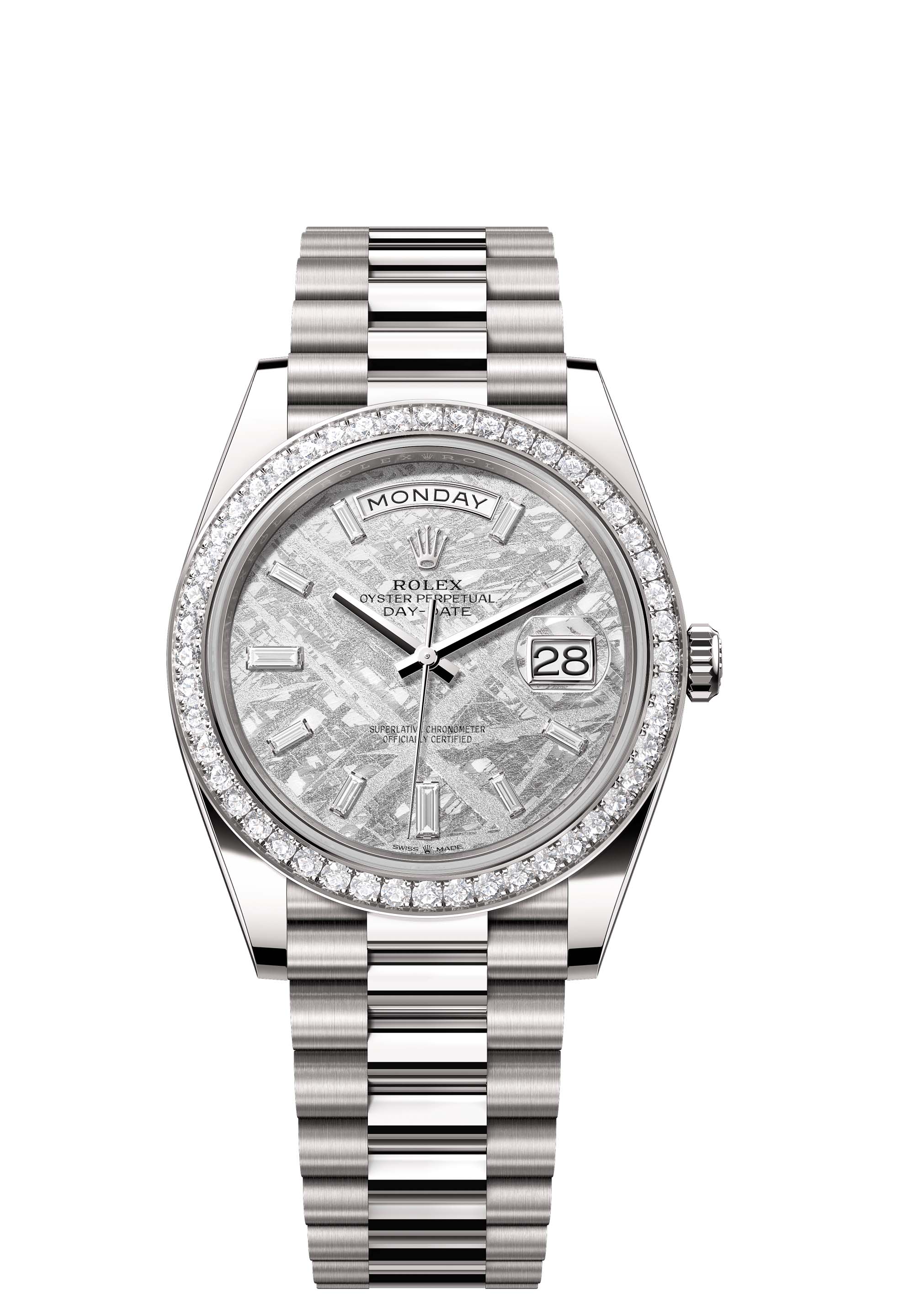 The Oyster Perpetual Day-Date 40 in 18 ct white gold, with a meteorite, diamond-set dial, diamond-set bezel and a President bracelet.