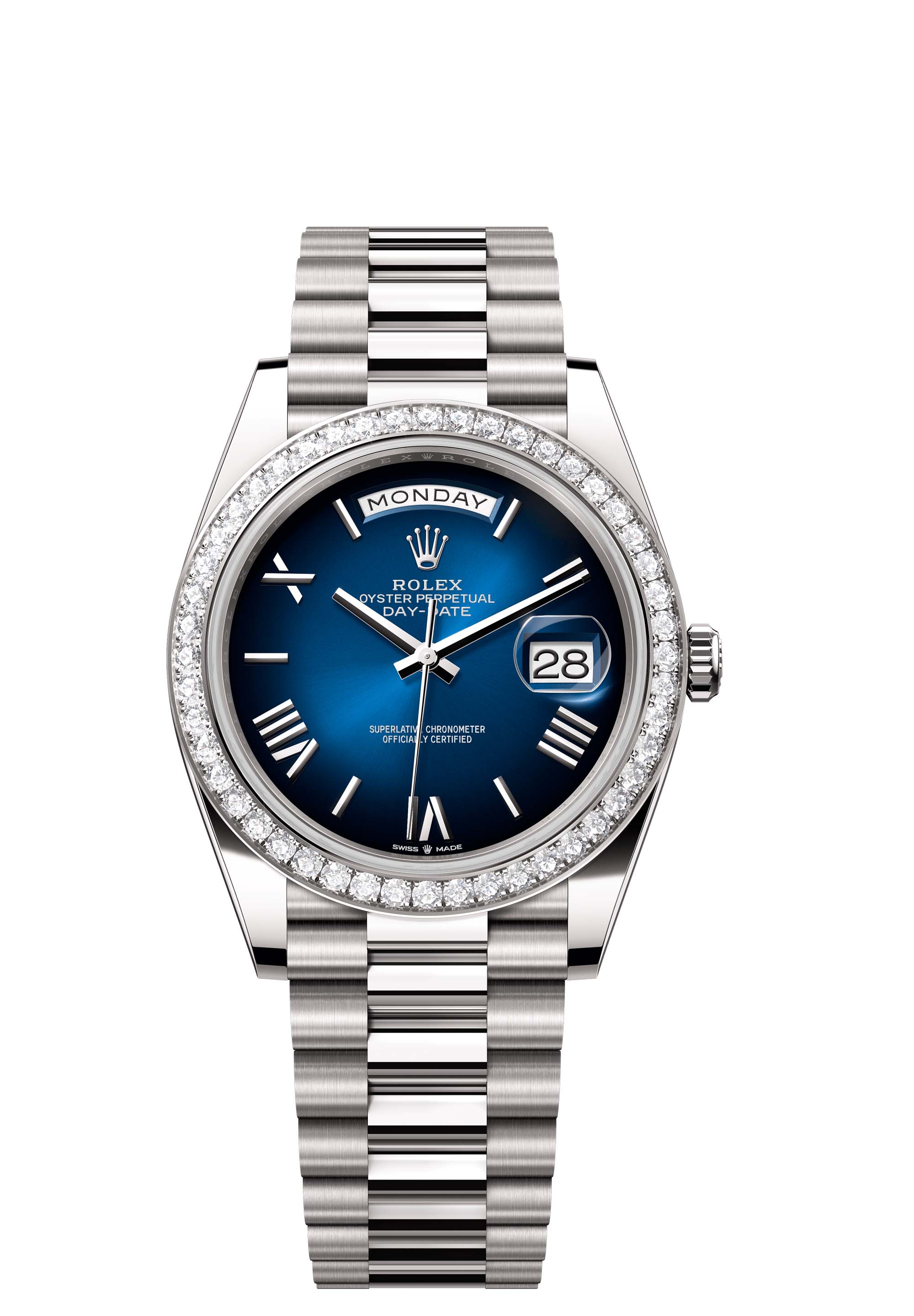 The Oyster Perpetual Day-Date 40 in 18 ct white gold with a blue ombré dial, diamond-set bezel and a President bracelet.