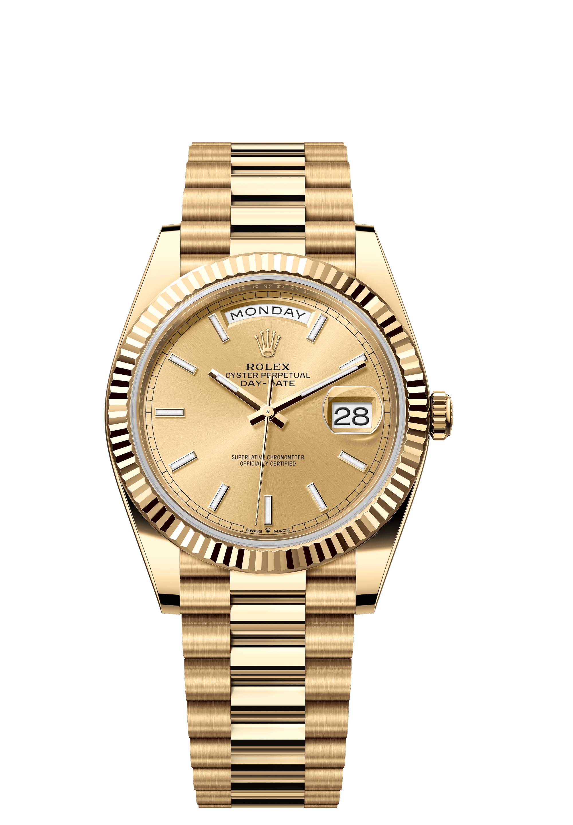 The Oyster Perpetual Day-Date 40 in 18 ct yellow gold with a champagne-colour dial, fluted bezel and a President bracelet.