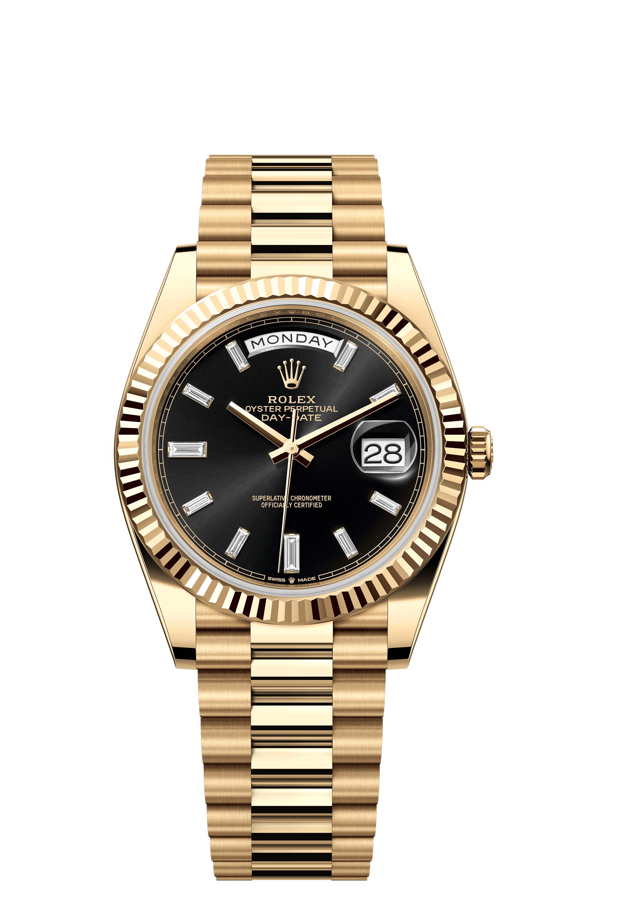 The Oyster Perpetual Day-Date 40 in 18 ct yellow gold with a bright black, diamond-set dial, fluted bezel and a President bracelet.